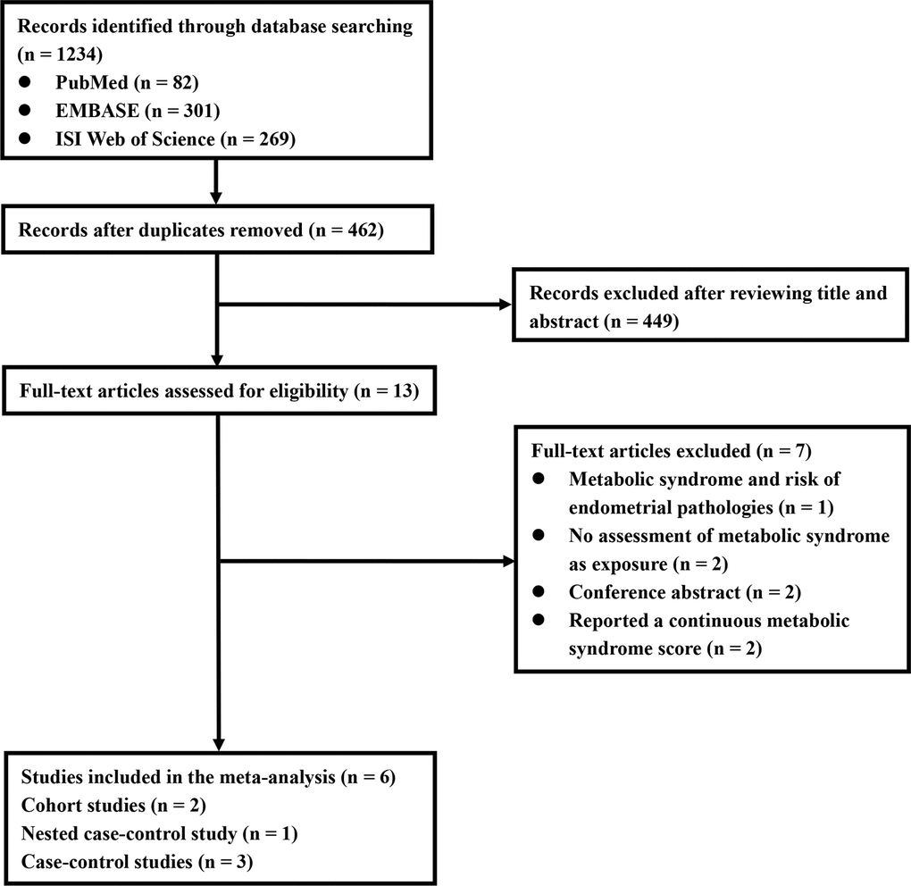 As shown in Figure 1, a literature search identified 82, 269, and 301 potentially relevant records from PubMed, Web of Science, and EMBASE electronic bibliographic databases, respectively. A total of 462 records remained after the removal of duplicates. We excluded 449 records after screening titles and abstracts, and 13 articles were carefully scrutinized by reading the full text. Seven articles were excluded because of the following reasons: (i) the EC relevant outcome was not available (n = 1), (ii) MetS was not considered as the exposure (n = 2), (iii) the association between the per unit increase in the MetS score and the risk of EC was reported (n = 2), and (iv) the article was a conference abstract (n = 2). Finally, six studies were identified and included in our meta-analysis. Six studies [17–22] described the association between MetS, diagnosed according to NCEP-ATP III criteria, and EC risk. Five studies [17–20, 22] described the association between MetS, diagnosed according to the criteria of the International Diabetes Federation (IDF), and EC risk.