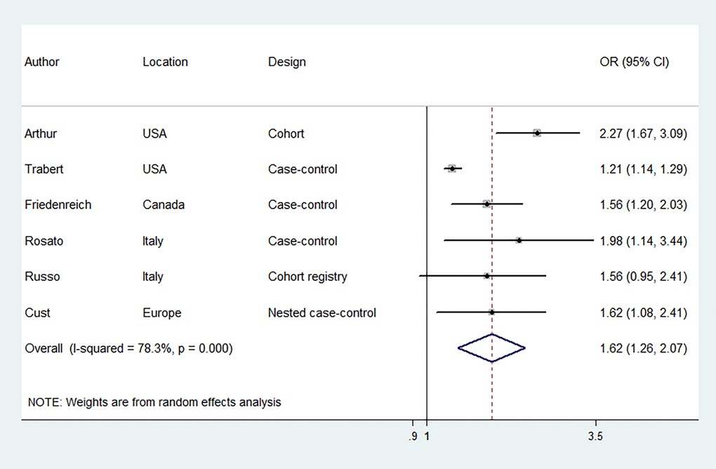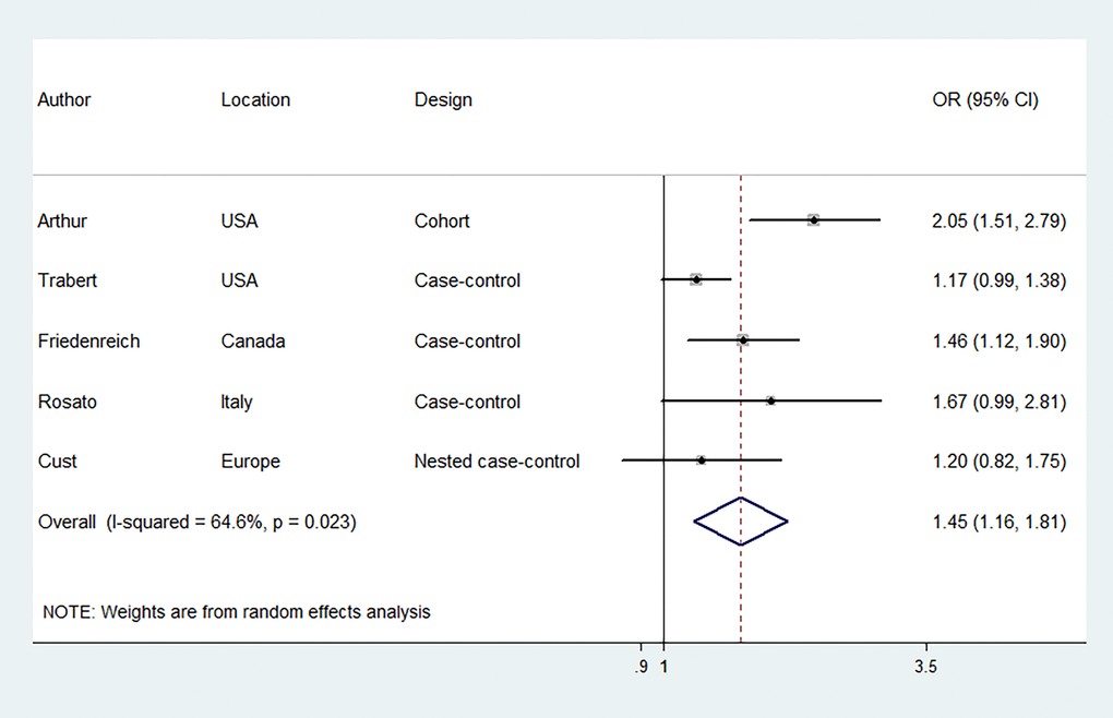| Retrospective studies | 3 | 1.42 (1.10-1.84) | 68 | 3 | 1.32 (1.08-1.60) | 34.7 | |||||||||||||||||||||||||||||||||||||||||||||||||||||||||||||||||||||||||||||||||||||||||||||