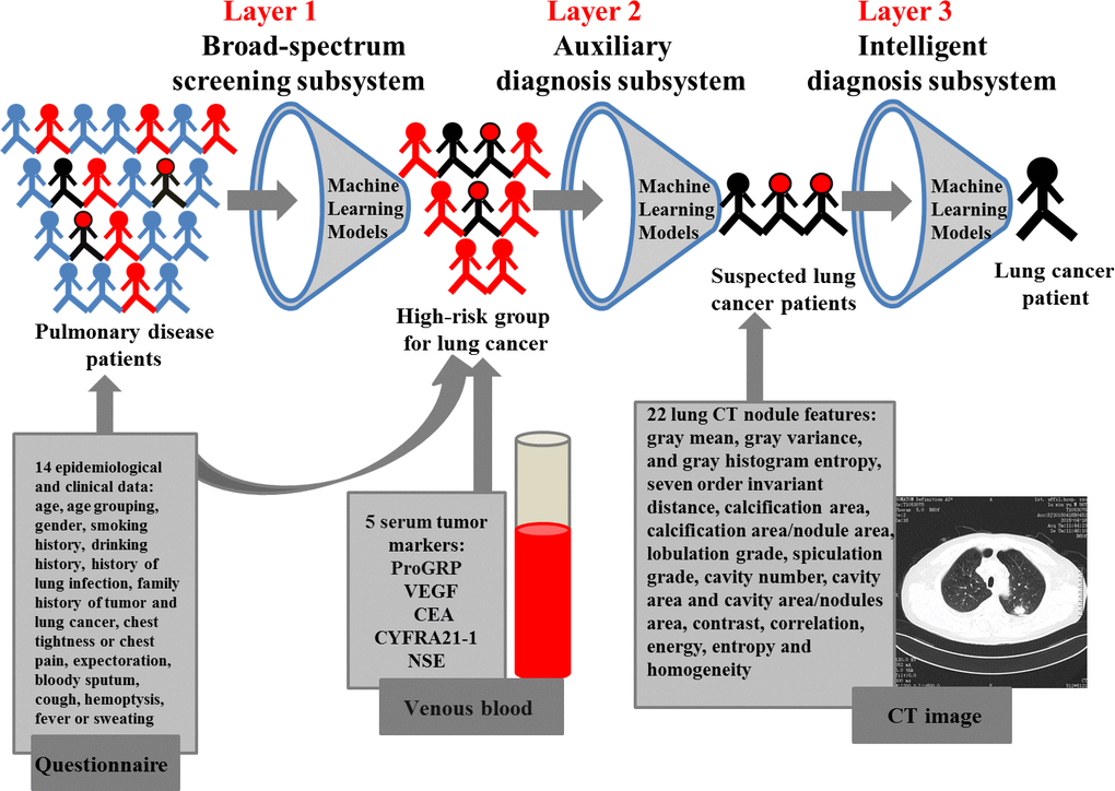 Based on our results, we propose an efficient diagnostic strategy for lung cancer, which contains a three-layer system structure. The first layer that broad-spectrum screening subsystem is constructed based on 14 epidemiological characteristics and clinical symptoms using an ANN model for screening high-risk groups from patients with pulmonary diseases. The second layer is an auxiliary diagnosis subsystem built on epidemiological characteristics, clinical symptoms, and 5 serum tumor markers of lung cancer, including ProGRP, VEGF, CEA, CYFRA21-1, and NSE, with an ANN model for searching suspected lung cancer patients from high-risk groups. The third layer that intelligent diagnosis subsystem is developed based on 22 lung CT nodule-based radiomic features using a C5.0 model for the further confirmation of lung cancer patients. The patients with lung cancer will be diagnosed step by step, so as to reduce the radiation hazard, over-diagnosis, and financial costs. This strategy can be used for the on-site screening and clinical diagnosis of the high-risk population.