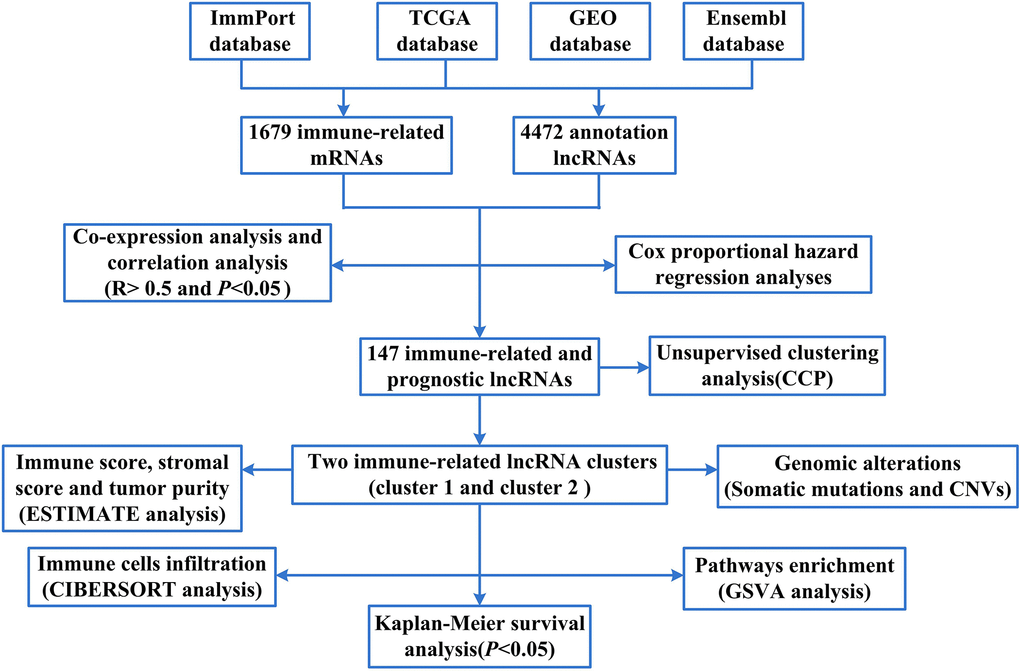 Using survival package of R language, survival analysis was used to compare the survival curves of different immune-related lncRNA clusters. The Cox proportional hazard regression analyses was performed prognostic analysis. The correlation analysis was determined by Pearson's correlation. In addition, t-test, Pearson's Chi-square test or Fisher’s exact probability test was used to estimated statistical significance. P < 0.05 was considered statistically significant.