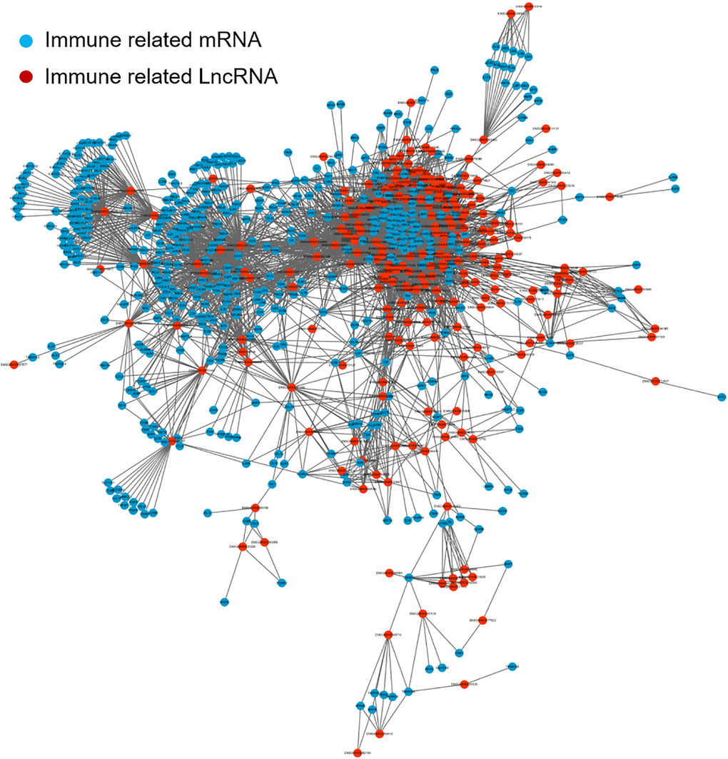 Long non-coding RNAs (lncRNAs) are non-coding RNAs without protein-coding capacity and are >200 nucleotides (nt) long [8]. LncRNA functions have been discovered in chromatin interactions, transcriptional regulation, RNA processing, mRNA stability or translation, and signal cascade regulation [9–14]. Increasing evidence shows that lncRNAs can regulate not only the innate immune response but also the more sophisticated adaptive immune response as well as immune cell development [15–18]. Moreover, lncRNAs may be pivotal regulators in remodeling the tumor microenvironment (TME) [17, 19, 20], which forms complex and heterogeneous environments consisting of multiple cells, such as infiltrating immune cells and stromal cells [21]. For instance, lnc-EGFR also acts as an immune-suppressor by promoting regulatory T cells differentiation in hepatocellular carcinoma [22]. NF-κB interacting NKILA (an lncRNA) enhances T cell sensitivity to activation-induced cell death by mechanically inhibiting NF-κB signaling [23]. Lymph node metastasis associated transcript 1 (LNMAT1), also a new lncRNA, is involved in the regulation of C-C motif chemokine ligand 2 (CCL2) recruiting macrophages into the tumor [24]. The involvement of lncRNAs in immune regulation is complicated, and many key immune regulatory lncRNAs have not yet been identified. Hence, it is urgent needed to identify new immune-related lncRNAs and elucidate their interactions with immune system in TME.