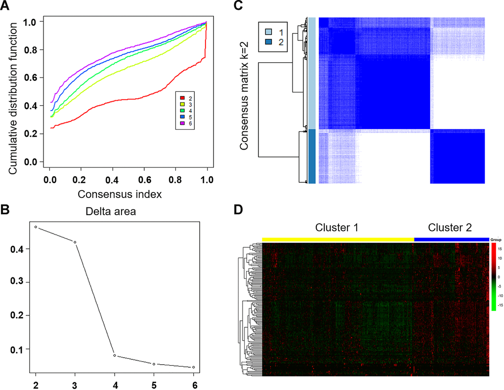 To analyze the expression of immune-related lncRNA in different tumor clusters, the R software package of Consensus Cluster Plus (CCP) [44] was applied to perform a tumor cluster classification. The algorithm began by subsampling a proportion of items and a proportion of features from a data matrix. Each subsample was then partitioned into up to k groups by a user-specified clustering algorithm. The maximum number of clusters was set to 6, and the optimal number of clusters was determined according to the consensus index and Cumulative Distribution Function (CDF). Heat map clustering of the immune-related lncRNAs were drawn using the R software plots package.