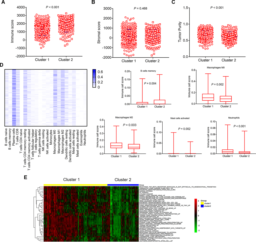 Interestingly, we found two clusters of LUAD samples based on immune-related lncRNAs with significant differences in immune microenvironment and genomic alterations. Infiltrating immune cells are an integral component of TME and play an important role in shaping the TME [36, 37]. Previous reports have provided elegant analysis how lncRNAs involve innate and adaptive immune responses by modulating the functional status of immune cells [15–18, 22–24]. We analyzed composition and immune cell types of the TME in different immune-related lncRNA clusters. The results showed that the cluster 1 had lower immune score, and higher tumor purity than the cluster 2. Simultaneously, there were differences in 5 types of immune cells. The relative levels of immune cell types in cluster 1 were higher than the cluster 2, such as Macrophages M0 (P=0.002), Macrophages M2 (P=0.003), Mast cells activated (P=0.002), Neutrophils (P<0.001), apart from B cells memory(P=0.004), which was lower in cluster 1. The 5 types of immune cells are thought to be involved in the regulation of innate and adaptive immune responses and play an important role in anti-tumor immunity. M2 macrophages play a suppressive role in immune function. Our result showed that the immune score in cluster 1 was low, and the components of most macrophages (M0 and M2) were relatively high, indicating a stronger immunosuppressive response in cluster1. The above results suggested that cluster 1 had a stronger immunosuppressive TME than cluster 2 in LUAD samples.