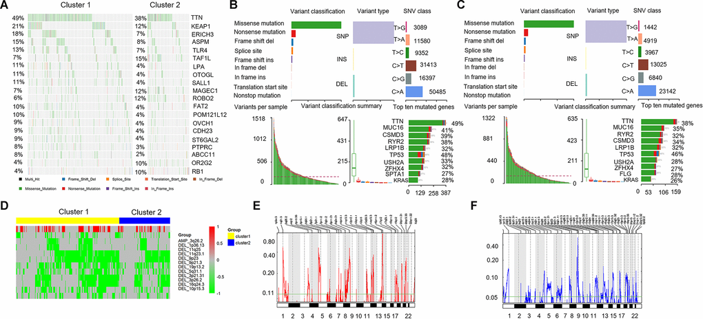 All gene somatic mutations of 500 samples were also downloaded from the TCGA. Fisher's exact test was used to identify differential genes with different immunotypes (P <0.05), and the mutated genes with the highest number from different clusters were compared to generate different mutation spectrum. Moreover, we also showed the variant classification, variant type, and SNV class in each cluster. Similarly, variants per sample, variant classification summary, and top ten mutated genes were all analyzed.