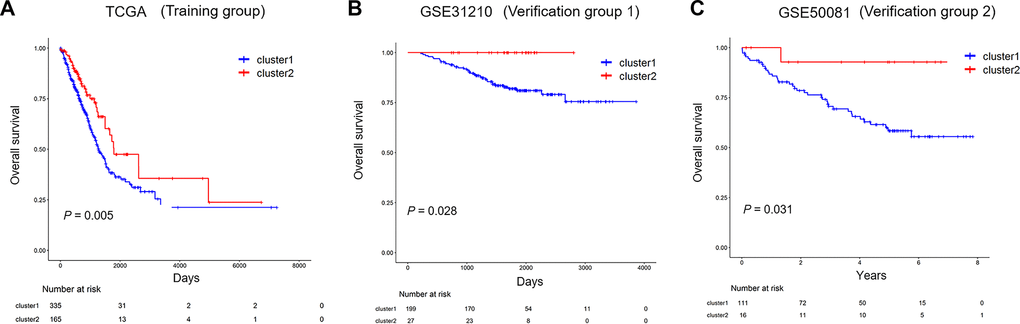 Finally, we investigated whether immune-related lncRNA clusters could predict the prognosis of the LUAD patients. Immune-related lncRNA clusterization analysis can well divide LUAD patients into cluster 1 and cluster 2 in the training and validating group, and cluster 1 was related to worse prognosis of LUAD patients. The above finding confirmed that the immune-related lncRNA cluster had reliable prognostic value.