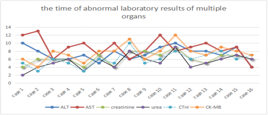 Among the 24 severe COVID-19 patients, only 16 cases were selected because of their complete electronic medical records, subsequently, the abnormal laboratory results of multiple organs, such as kidney (creatinine and urea), liver (alanine aminotransferase and aspartate aminotransferase), and heart (High sensitivity troponin T and creatine kinase-MB), were further analyzed. The laboratory results of acute renal function injury (4.94±1.69) occurred earlier than those of liver (7.81±1.86) and heart functions (6.19±1.83). One-way analysis of variance showed a statistically significant difference in laboratory results (p<0.01) between kidney and heart (p=0.056), kidney and liver (P<0.01), and heart and liver functions (P=0.014). However, several patients presented opposite trends. Further checking of the electronic medical record revealed that these patients were infected with hepatitis B and other common diseases, such as liver fibrosis, cyst, fatty liver, and cirrhosis (Figure 1).