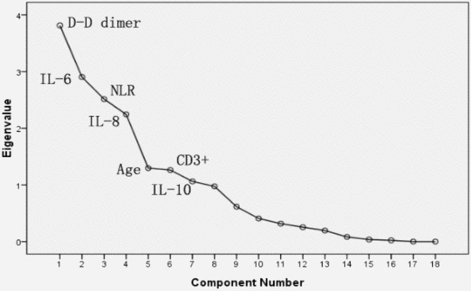 Continuous variables were expressed as means and standard deviations or medians and interquartile ranges as appropriate. Categorical variables were summarized as the counts and percentages in each category. Wilcoxon rank-sum tests were applied to continuous variables. Chi-square tests and Fisher’s exact tests were used for categorical variables as appropriate. Optimal cutoff values of the continuous neutrophil (NEU)-to-LYM ratio (NLR), Age, D-D, IL-2, IL-6, IL-8, and CRP were calculated by applying the receiver operating curve analysis (ROC). Hazard risk and 95 % confidence interval were used as common measures to assess relative risk. Principal component analysis (PCA) was performed to identify the major contributing factors among clinical parameters to distinguish mild and severe cases of COVID-19 patients. P<0.05 was recognized as statistically significant. All statistical calculations were performed using SPSS 17.0 software (SPSS Inc, Chicago, USA).