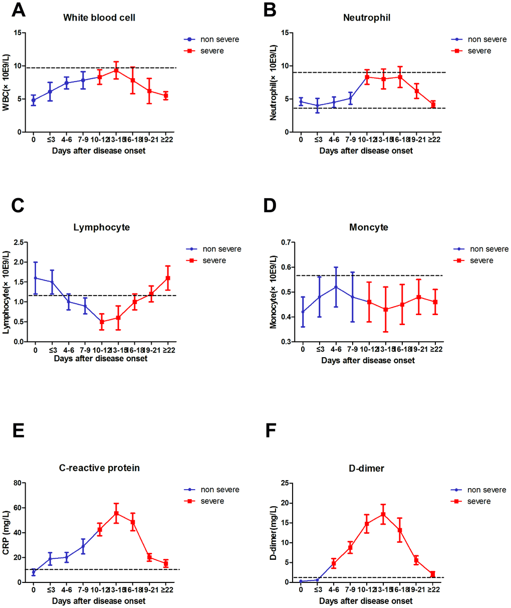 The absolute numbers of total WBCs (A), NEU (B), LYM (C), MON (D), CRP (E), and D-D (F) in the peripheral blood of mild (blue line) and severe (red line) COVID-19 patients were analyzed at different time points after hospital admission. Error bars represent mean ± SD. From non-severe to severe cases, the time for D-D to change from lower normal limit to upper normal limit was significantly earlier than that for other biomarkers, and the change was more evident (Figure 4).