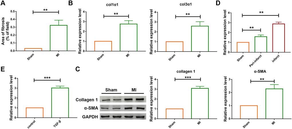 A four-week chronic myocardial infarction murine model was built to evaluate the effect of lncRNA SNHG7 in cardiac remodeling., The area of cardiac fibrosis was found to be increased in MI group as compared with that of the sham-operated group, as shown in Figure 1A. The result of qRT-PCR analysis also indicated that the expression of mRNA of Col 1a1 and Col 3a1 were upregulated in the ventricular tissue of MI mice (Figure 1B). Furthermore, the protein levels of collagen and α-SMA were examined using western blotting analysis (Figure 1C). Compared with the sham-operated group, the expression level of collagen and α-SMA were upregulated in mice suffering from MI. All the above data indicated the successful construction of the MI model. Then the mRNA level of lncRNA SNHG7 was determined in the cardiac tissue, cardiomyocytes and cardiac fibroblasts using qRT-PCR analysis. lncRNA level was increased both in the infarct and peri-infarct tissue as well as in fibroblasts in mice after MI, as shown in Figure 1D, 1E.