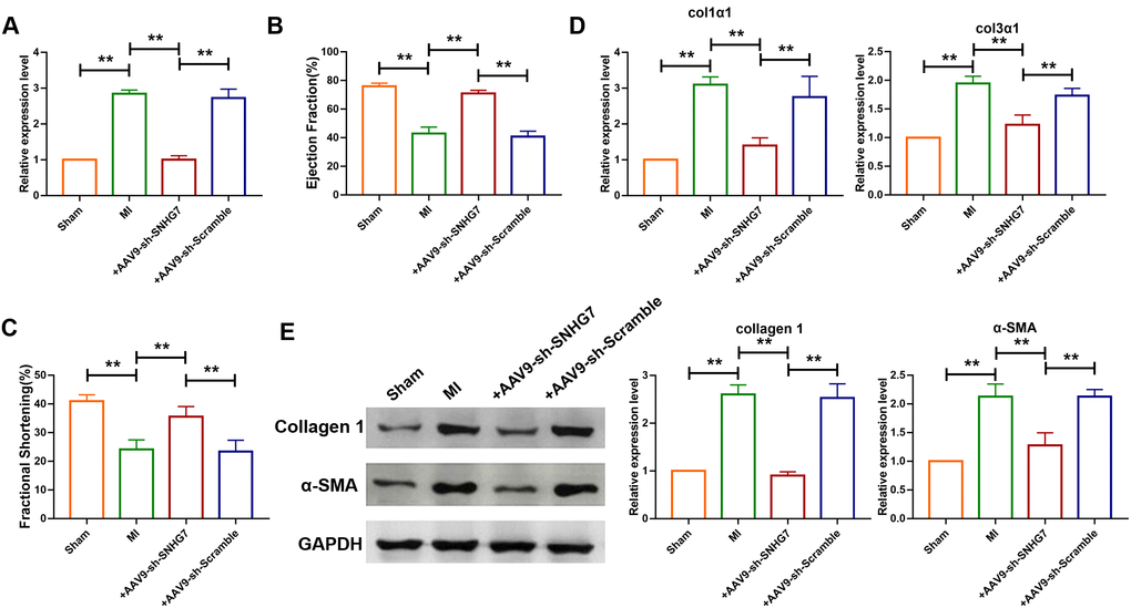 To explore the role of lncRNA SNHG7 in pathogenesis of MI, adenovirus carrying a SNHG7-specific short-hairpin RNA (AAV9-shSNHG7) was constructed to suppress the expression of lncRNA SNHG7 in vivo. The virus was intravenously injected via tail 1 week before the MI surgery and qRT-PCR analysis showed that the expression of lncRNA SNHG7 was significantly downregulated in mice administered with the injection of AAV9-shSNHG7 as compared with that of the MI group (Figure 2A). However, the downregulation was not observed in AAV9-scramble group. Echocardiographic findings revealed the recovery of ejection fraction (EF) and fraction shortening (FS) after the inhibition of lncRNA SNHG7 in MI mice (Figure 2B, 2C), suggesting the cardioprotective effect of lncRNA SNHG7 silencing. The expression of mRNA and protein level of collagen were also determined using western blotting and qRT-PCR analysis and the results showed that inhibition of lncRNA SNHG7 significantly diminished the expression of collagens as well as α-SMA(Figure 2D, 2E). These data demonstrated that lncRNA SNHG7 could promote cardiac remodeling after MI and silencing of SNHG7 could significantly attenuate the collagen deposition and cardiac remodeling. (Figures 1 and 2)