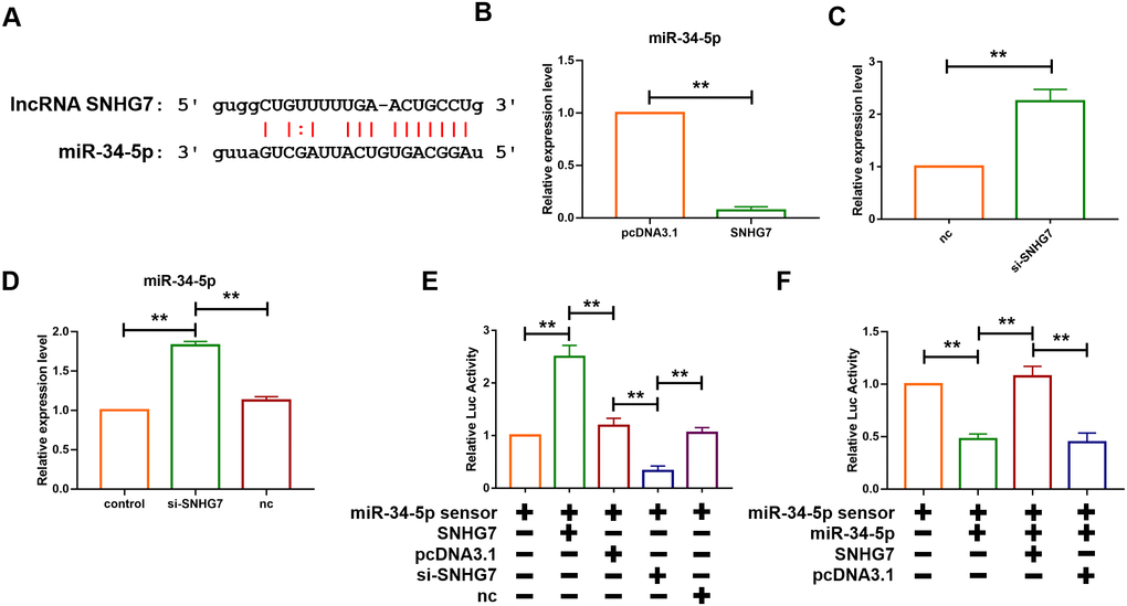 The function of lncRNAs as a ceRNA has been widely reported. To further evaluate the role of SNHG7, the starbase database (http://starbase.sysu.edu.cn/), a bioinformatics prediction website, was utilized to predict the target of SNHG7 and it was found that there are binding sites of SNHG7 on the sequence of miR-34-5p (Figure 3A). Furthermore, the loss- and gain-of-function experiment was performed to reveal the relationship between SNHG7 and miR-34-5p. The plasmid of SNHG7 was transfected into cardiac fibroblasts to overexpress lncRNA SNHG7. Overexpression of SNHG7 significantly inhibited the expression level of miR-34-5p, as compared with the pcDNA group (Figure 3B). Moreover, RNA interference experiment showed that knockdown of SNHG7 by si-RNA elevated the expression level of miR-34-5p (Figure 3C). Meanwhile, it was revealed that inhibition of SNHG7 in mice could also lead to upregulation of miR-34-5p (Figure 3D). To evaluate the targeting correlation between SNHG7 and miR-34-5p, miR-34-5p sensor luciferase reporter vector with a perfect miR-34-5p binding site containing the 3’UTR of the luciferase reporter gene was constructed. As shown in Figure 3D, the luciferase activity of miR-34-5p sensor was enhanced in cardiac fibroblasts after transfection of SNHG7, compared with the pcDNA group (Figure 3E). In contrast, SNHG7 silencing significantly reduced the luciferase activity of miR-34-5p. Furthermore, forced expression of miR-34-5p suppressed the luciferase activity of sensor and co-transfection of miR-34-5p and SNHG7 alleviated that effect (Figure 3F). Binding of SNHG7 to miR-34-5p was also detected by directly constructing luciferase reporter vector containing SNHG7 fragment with the normal or mutated binding sites for miR-34-5p. miR-34-5p inhibited the luciferase activity of the wild-type SNHG7 vector and had no effect on mutated SNHG7 vector. However, the mutated miR-34-5p had no effect on both vectors. These data indicated that lncRNA SNHG7 can directly target miR-34-5p as a ceRNA (Figure 3).