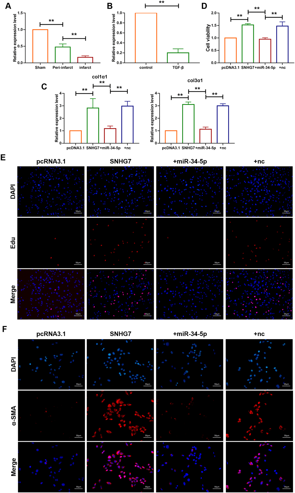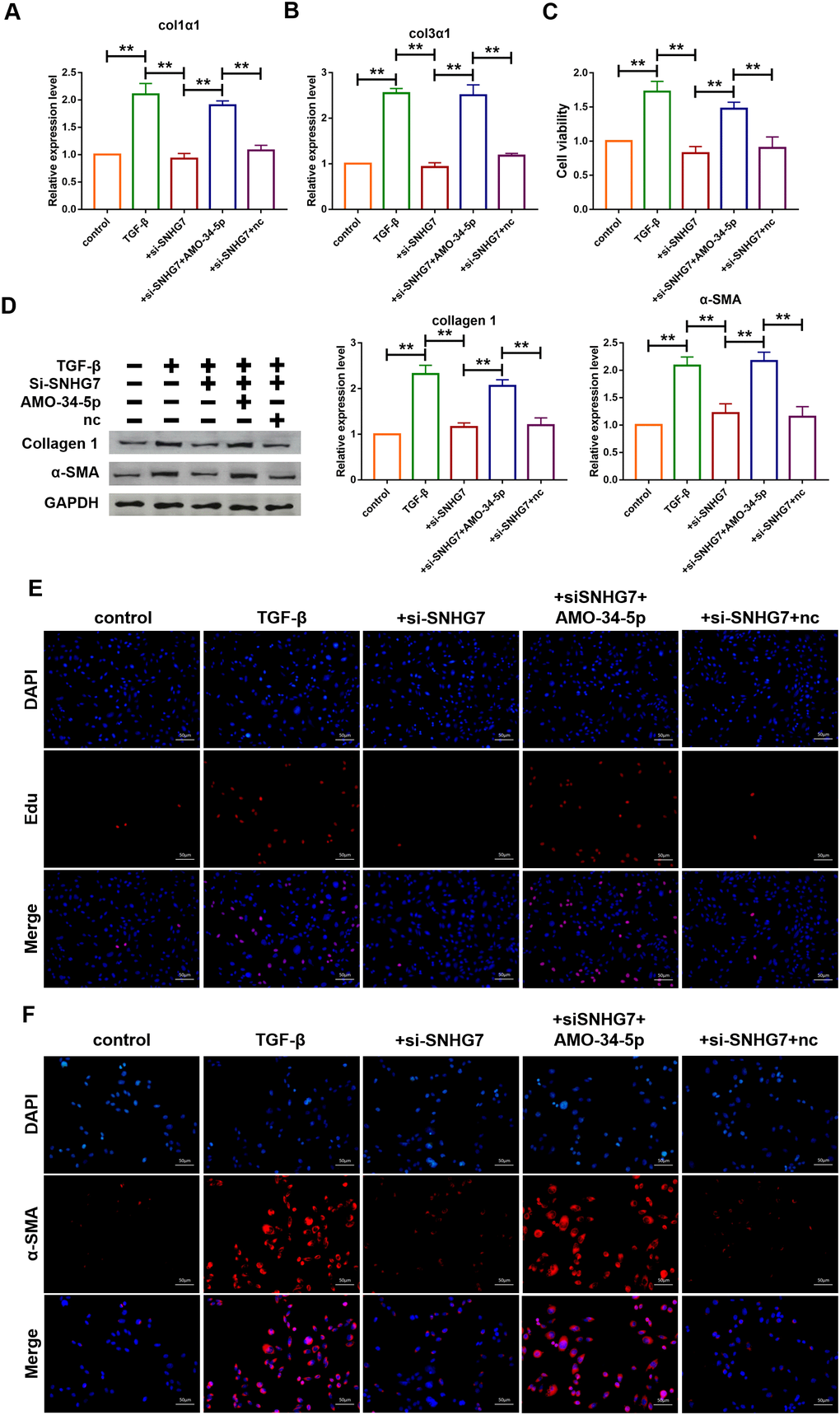The role of SNHG7 on fibrogenesis was explored using qRT-PCR analysis and the results showed that transfection of si-SNHG7 significantly inhibited the mRNA expression levels of Col1α1 and Col3α1 (Figure 5A, 5B). In contrast, the inhibition was recovered by the co-transfection of AMO-34-5-p (20 nM). MTT assay was performed to determine cell viability of cardiac fibroblasts. Compared with the TGF-β1 treatment group, inhibition of SNHG7 reduced cell viability of cardiac fibroblasts (Figure 5C). Knockdown of miR-34-5p by AMO-34-5p was found to reversely increase cell viability of cardiac fibroblasts. In addition, western blotting analysis also showed that silencing of SNHG7 suppressed the expression levels of Col1α1 and α-SMA, which could be abolished by treatment with AMO-34-5p (Figure 5D). Cell proliferation and fibroblast-myofibroblast transition were detected to collect further evidence of SNHG7 effect on fibrogenesis. As shown in Figure 5E, knockdown of SNHG7 inhibited the TGF-β1 induced proliferation of cardiac fibroblasts. However, co-transfection with AMO-34-5p was found to promote the proliferation of cardiac fibroblasts. Moreover, the fibroblast-myofibroblast transition induced by treatment of TGF-β1 was diminished by SNHG7 silencing and recovered by co-transfection of AMO-34-5p (Figure 5F). These data indicated that silencing of SNHG7 could alleviate TGF-β1 induced fibrogenesis in cardiac fibroblasts (Figure 5).