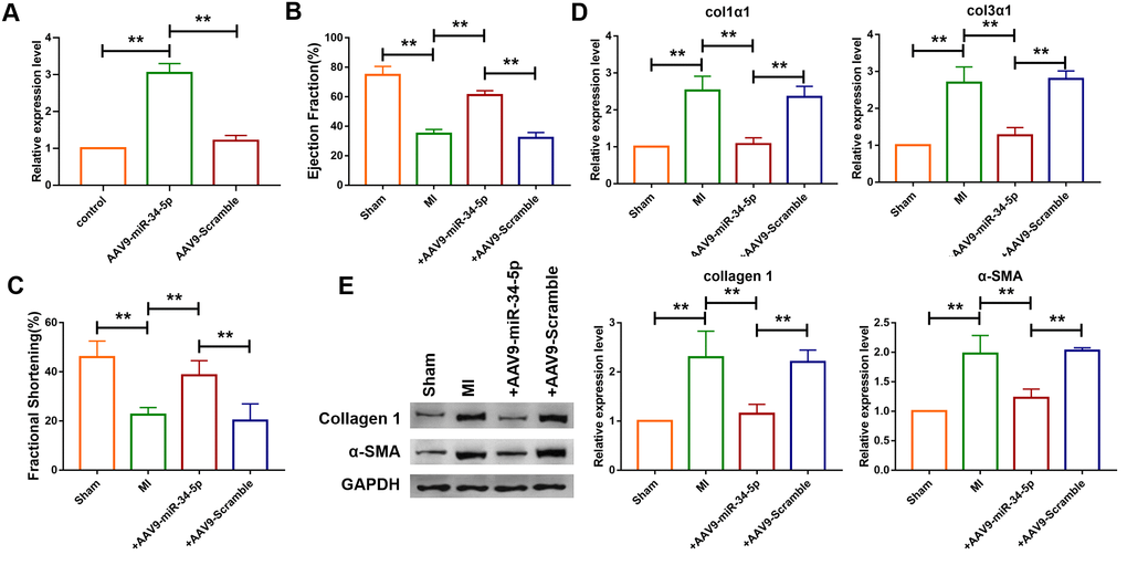 The mechanism of miR-34-5p in vivo in mice was further investigated. Recombinant adeno-associated virus 9 carrying miR-34-5p precursor (AAV9-miR-34-5p) was initially constructed and injected into mice to overexpress the level of miR-34-5p. As shown in Figure 6A, administration of AAV9-miR-34-5p significantly increased the expression level of miR-34-5p. Echocardiographic findings showed that overexpression of miR-34-5p improved the EF and FS in mice with MI (Figure 6B, 6C). In addition, qRT-PCR analysis demonstrated that upregulation of Col1α1 and Col3α1 levels induced by MI were inhibited by the administration of AAV9-miR-34-5p (Figure 6D). Western blotting analysis revealed that forced expression of miR-34-5p reduced protein levels of Col 1 and α-SMA which were increased in mice with MI (Figure 6E).