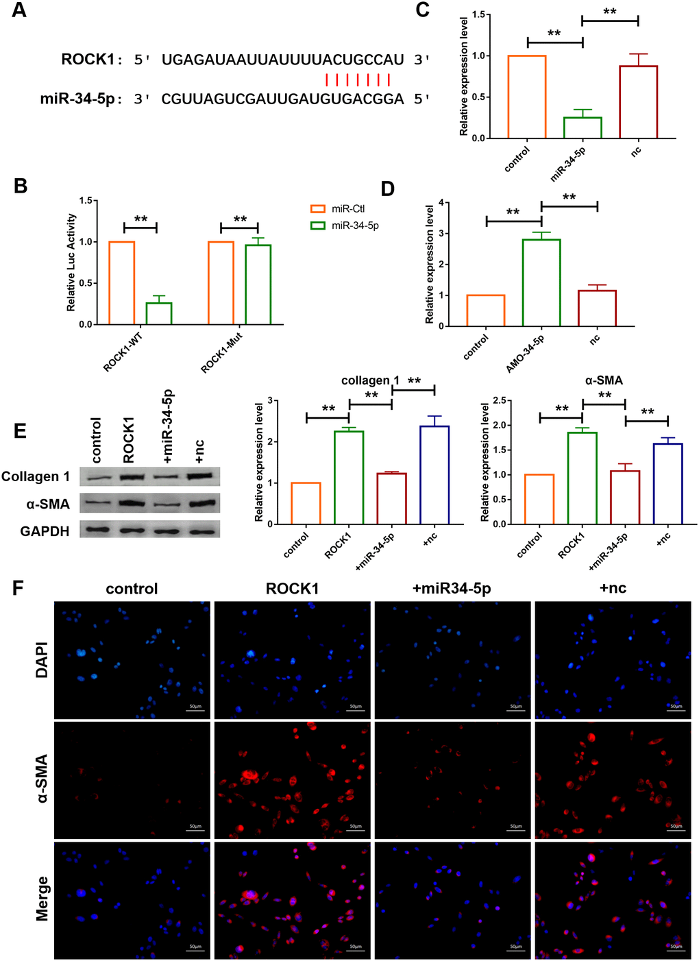 Targetscan database was utilized to further detect the target gene of miR-34-5p, and it was found that there are perfect binding sites of miR-34-5p on the 3’UTR of ROCK1 gene sequence (Figure 7A). Subsequently, luciferase reporter assay was used to examine the interaction between miR-34-5p and ROCK1. As shown in Figure 7B, miR-34-5p, which had no effect on the vector carrying mutated binding site (ROCK1-Mut), inhibited the activity of wild-type ROCK1 (ROCK1-WT) luciferase reporter vector (Figure 7B). Loss-of-function and gain-of-function approaches were utilize to further explore the role of ROCK1 as the target gene of miR-34-5p in cardiac fibroblasts. The result showed that miR-34-5p mimics decreased the expression of ROCK1 and transfection of AMO-34-5p significantly elevated the protein expression level of ROCK1 (Figure 7C, 7D). In addition, western blotting analysis indicated that overexpression of ROCK1 increased the protein expression levels of Col 1 and α-SMA and the effects were diminished by forced expression of miR-34-5p (Figure 7E). Fibroblast-myofibroblast transition was also detected (Figure 7F), and miR-34-5p was found to diminish the promotive effect of ROCK1 on fibroblast-myofibroblast transition of cardiac fibroblasts. These data suggested that the anti-fibrosis function of miR-34-5p was mediated by targeting ROCK1 signaling pathway (Figure 7).