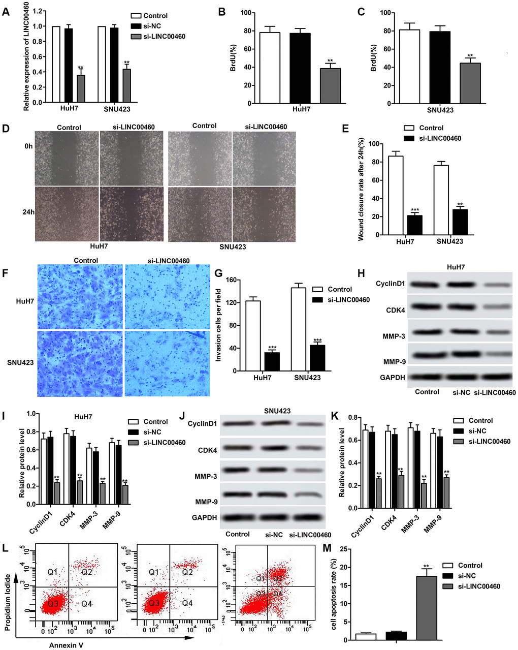 In order to investigate the effects of LINC00460 in HCC progression, specific si-LINC00460 was transfected into HuH7 and SNU423 cells respectively as shown in Figure 2A. At the same time, si-NC was used as a blank. Then, Bromodeoxyuridine assay was used to value cell proliferation as shown in Figure 2B, 2C and we found that cell proliferation was both suppressed in si-LINC00460 group in HuH7 and SNU423 cells compared with the control. The results of the wound healing assay and the data statistics in Figure 2D, 2E showed that knockdown of LINC00460 effectively suppressed cell migration. Besides that, the transwell invasion assay showed less invasive cells in the si-LINC00460 group than the control group (Figure 2F–2G). Results of western blot also showed that knockdown of LINC00460 suppressed the expression of cell proliferation related proteins CyclinD1 and CDK4, inducing obvious cell cycle arrest. The expression of cell migration related proteins MMP-3 and MMP-9 was also greatly suppressed by the transfection of si-LINC00460 in both HuH7 and SNU423 cells (Figure 2H–2K). And beyond this, cell apoptosis was valued through flow cytometry and it showed that silencing of LINC00460 promoted cell apoptosis comparing to the control (Figure 2L–2M). Thus, knockdown of LINC00460 effectively suppresses HCC cell proliferation, migration and invasion and promotes cell apoptosis.