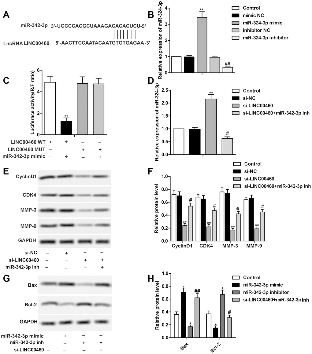 The result of bioinformatics prediction showed that there existed complementary sequence between LINC00460 and miR-342-3p (Figure 3A). Specific miR-342-3p mimic and miR-342-3p inhibitor were designed and synthesized to up-regulate or down-regulate the expression level of miR-342-3p by transfecting into HuH7 cells as shown in Figure 3B. The results of the luciferase reporter assay showed that the combination of miR-342-3p mimic with LINC00460 WT largely decreased luciferase activity compared with the other groups, further indicating that there exists targeting relationship between miR-342-3p mimic with LINC00460 (Figure 3C). The results in Figure 3D showed that relative expression of miR-342-3p was elevated in the si-LINC00460 group but was then suppressed with the combination of miR-342-3p inhibitor. Then we found that the inhibiting effect of si-LINC00460 on CyclinD1, CDK4, MMP-3 and MMP-9 was largely weakened by the adding of miR-342-3p inhibitor (Figure 3E, 3F). In addition, we found that cell apoptosis was largely enhanced by miR-342-3p mimic and was strongly inhibited by miR-342-3p inhibitor. At the same time, suppressed cell apoptosis by miR-342-3p inhibitor was then elevated in the existence of si-LINC00460 (Figure 3G, 3H). The above results showed that si-LINC00460 suppressed cell proliferation and cell mobility and promoted cell apoptosis by elevating the expression of miR-342-3p.