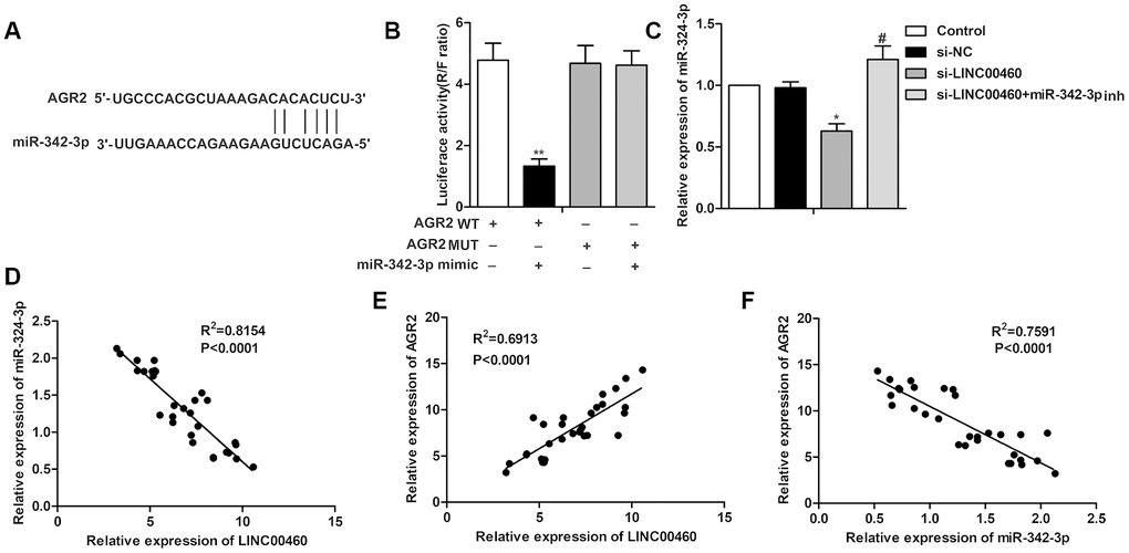 Further study showed that there also exist complementary sequences between AGR2 and miR-342-3p (Figure 4A). The targeting relationship between AGR2 and miR-342-3p was further verified by the luciferase reporter assay which showed that the combination of AGR WT and miR-342-3p mimic largely decreased luciferase activity compared with the control group (Figure 4B). The results in Figure 4C showed that the level of AGR2 was suppressed by si-LINC00460 and was then elevated with the combination of miR-342-3p inhibitor. The trend lines in Figure 4D–4F also showed that the level of LINC00460 was positively related to AGR2 and negatively related to the expression of miR-342-3p. In addition, the level of AGR2 was negatively related to the expression of miR-342-3p. Thus, the above results showed that knockdown of LINC00460 suppressed AGR2 expression by targeting miR-342-3p.