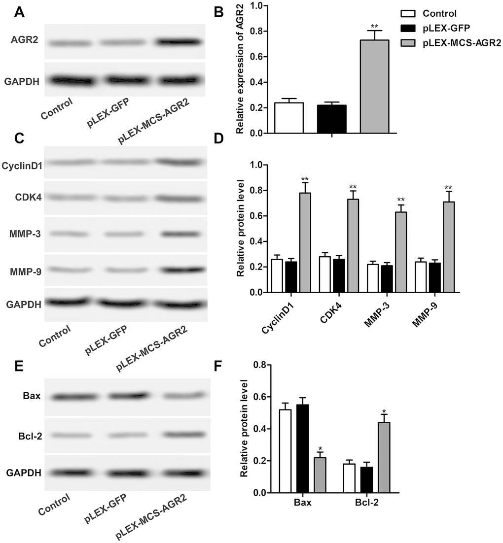 In order to investigate the effect of AGR2 in the progression of HCC, recombinant plasmid pLEX-MCS-AGR2 was constructed and transfected into HuH7 cells to up-regulate the expression of AGR2 as shown in Figure 5A, 5B. Then the results of western blot showed that overexpression of AGR2 induced elevation of CyclinD1, CDK4, MMP-3 and MMP-9, indicating that overexpression of AGR2 promoted the proliferation and cell mobility of HCC (Figure 5C, 5D). Detection about cell apoptosis also showed that overexpressed AGR2 markedly elevated expression of Bax and suppressed expression of Bcl-2 (Figure 5E, 5F). The above results showed that overexpression of AGR2 promoted the progression of HCC.