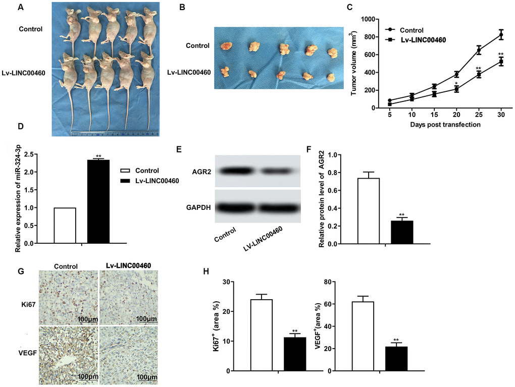 The in vivo experiments were further conducted to explore the effects of LINC00460 on HCC tumor progression. The result in Figure 6A–6C showed that knockdown of LINC00460 by transfected with Lv-LINCC460 suppressed the growth of HCC tumor compared with the control. The level of miR-342-3p was also elevated by Lv-LINCC460 as shown in Figure 6D. In addition, the expression of AGR2 was also decreased by Lv-LINCC460 (Figure 6E–6F). The results of immunohistochemical (IHC) also showed that knockdown of LINC00460 suppressed the expression of Ki67 and VEGF, thus inhibiting the progression of HCC in vivo (Figure 6G–6H). Thus, we concluded that knockdown of LINC00460 suppressed the progression of HCC in vivo by inhibiting cell proliferation and cell mobility.