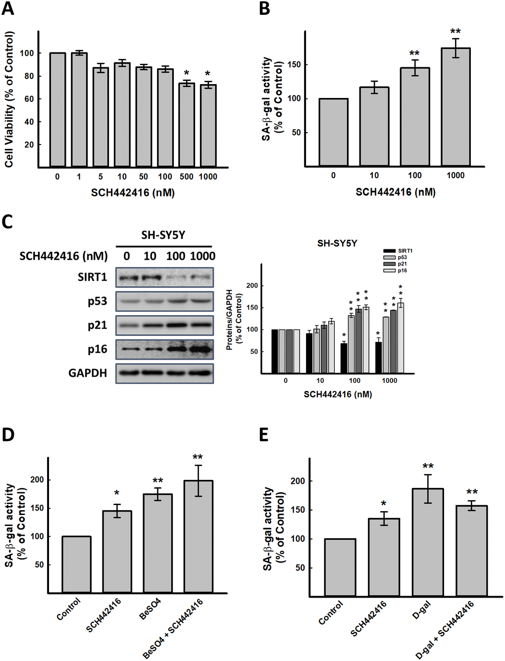 T1-11 is an agonist of A2AR. Next, we used SCH442416, a highly selective A2AR antagonist [19], was used to explore whether A2AR signaling inhibition affects on aging progress. As illustrated in Figure 2A, SCH442416 at 0.5 and 1 μM significantly decreased cell viability. SCH442416 enhanced SA-β-gal activity in SH-SY5Y cells in a concentration-dependent manner (p < 0.05, Figure 2B), and increased cellular senescence-associated molecules, p53, p21 and p16 in a concentration-dependent manner as well (Figure 2C). Besides, A2AR antagonists (SCH442416 or SCH58261) could abrogate the actions of T1-11 (Supplementary Figure 6). Combining the results of SCH442416 and BeSO4 and D-gal in SH-SY5Y cells exhibited that these agents have no synergistic effects on aging progress (Figure 2D, 2E).