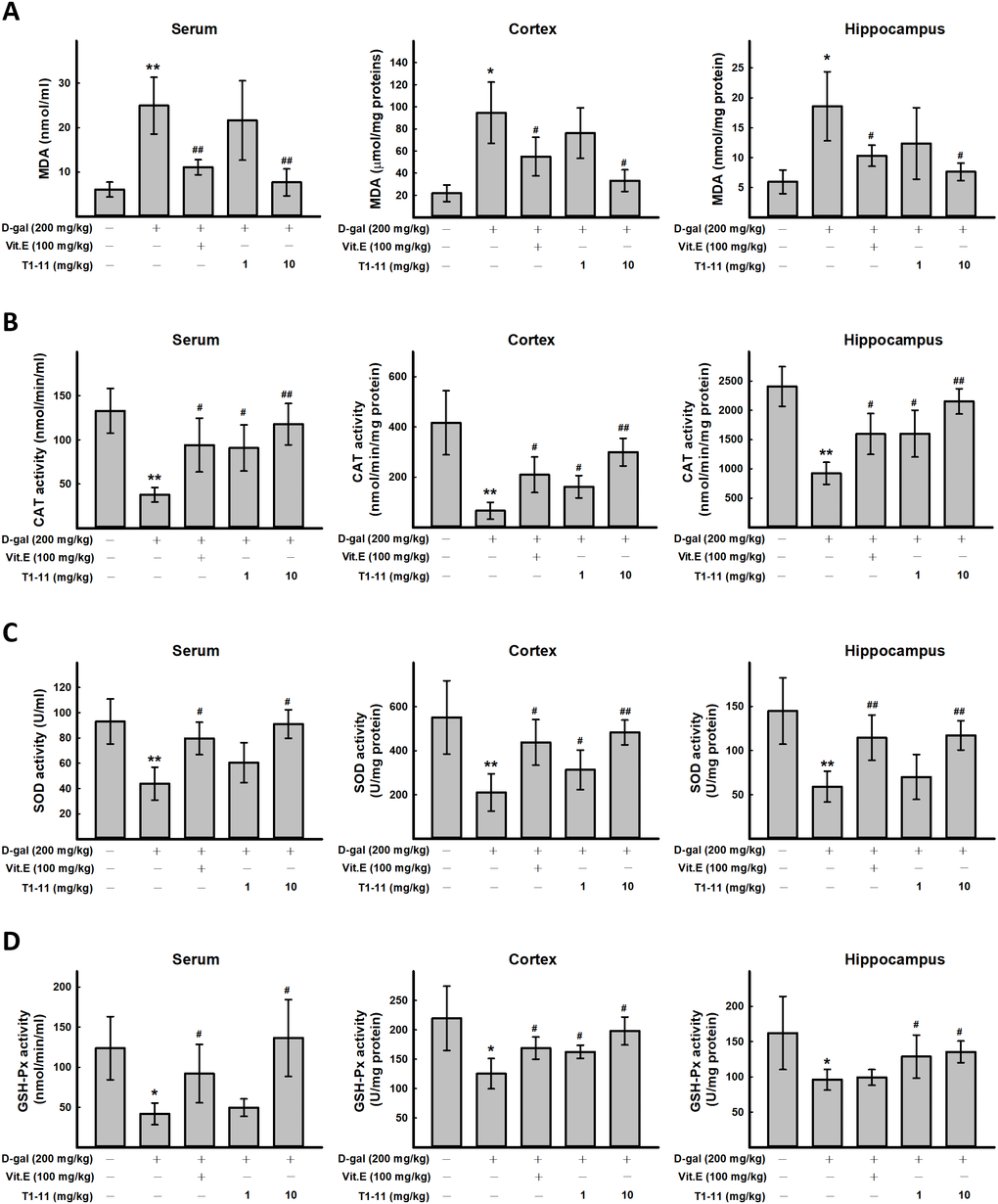 ROS plays an important role in aging. ROS production is one of the most important mechanisms underlying D-gal-induced aging [6]. In this study, the content of the oxidative stress marker malondialdehyde (MDA) and activities of antioxidative defense enzymes superoxide dismutase (SOD), catalase (CAT), and glutathione peroxidase (GSH-Px) in the cortex and hippocampal tissue and serum of mice as biomarkers of oxidative stress in D-gal-induced aging were measured. We found D-gal treatment greatly increased MDA level in serum, cortex, and hippocampus, and T1-11 significantly reversed the D-gal-induced MDA level (Figure 3A). Thus, the lipid peroxide process in mice was accelerated by D-gal, and T1-11 and Vit.E were effective in reducing MDA content in both brain tissue and serum. D-gal significantly decreased SOD, CAT and GSH-Px activities as compared with controls (Figure 3B–3D), which were markedly elevated with T1-11 and Vit.E treatments.
