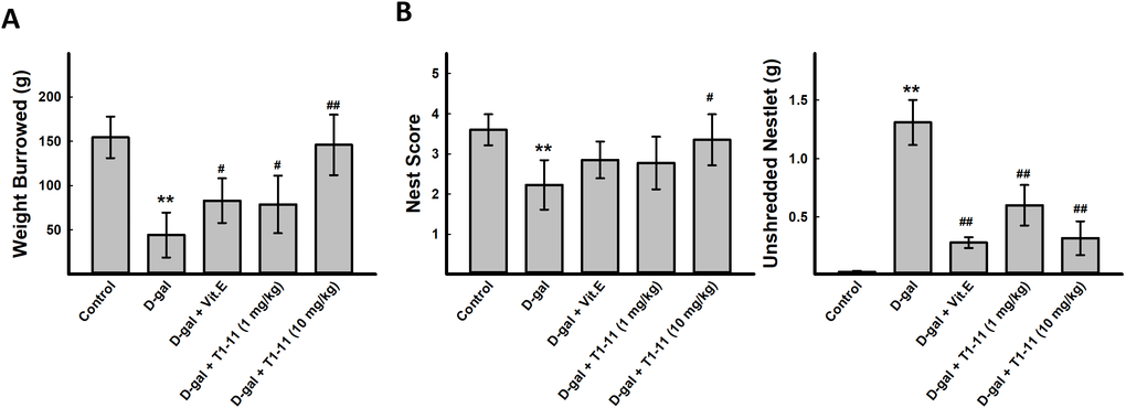 Cognitive behavioral deficit is one of the aging-related markers of brain dysfunction. A variety of species-specific spontaneous behaviors, including burrowing and nesting behaviors, which engage a broad network of brain regions, have previously been applied on evaluating the activities of daily living (ADL) skills of aging mice. Burrowing and nesting behaviors were examined. D-gal-induced aging mice showed deficits in spontaneous burrowing and nesting behaviors, which were significantly ameliorated by Vit.E treatment (100 mg/kg) and T1-11 at both 1 and 10 mg/kg in burrowing (Figure 4A) and the nest score and unshredded nestlet (Figure 4B).