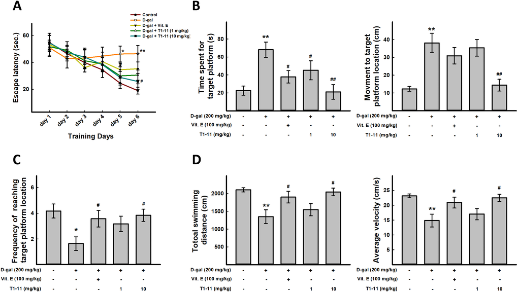 After 6 days of training, the probe trial was performed. D-gal-treated mice spent more time to find the target platform location as compared with controls, but less time in T1-11- and Vit.E-treated mice (Figure 5B). In addition, T1-11-and Vit.E-treated mice crossed the platform location more often than with D-gal alone (Figure 5C). These data suggest that T1-11 improves D-gal-induced spatial learning and memory impairment.