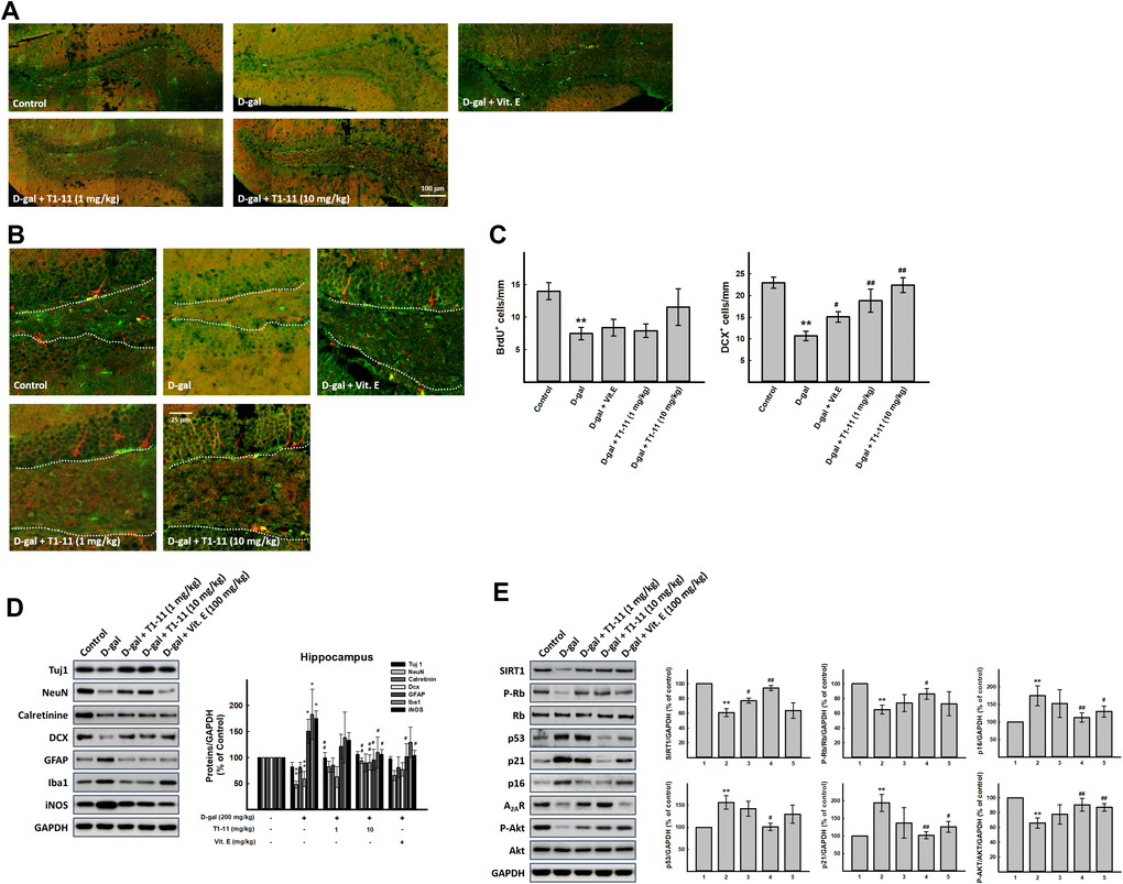 A total of 30 young adult male C57BL/6 mice (6 weeks old) were purchased from the National Laboratory Animal Center (Taipei). After 2 weeks of acclimatization, mice were randomly divided into 5 groups (n=6 each) for treatment: young control (control), D-galactose–induced mimetic aging model (D-gal), two doses of T1-11 (1 and 10 mg/kg), and vitamin E (Vit.E; 100 mg/kg) intervention aging groups. The Vit.E group was the positive control because it has antioxidant and anti-inflammatory properties and regulates adult neurogenesis [44]. The mice of D-gal, and T1-11 and Vit.E-treated groups were subcutaneously injected with 200 mg/kg D-gal daily for 8 weeks to establish the aging model. The subsequent doses of T1-11 (1 and 10 mg/kg) and one dose of Vit.E (100 mg/kg) were administered (i.g. oral gavage) every day. The mice of the young control group were similarly administered saline (0.1 ml/kg) for 8 weeks. All animals were allowed to move, drink, and take food freely. The animals were housed in standard polypropylene cages with a wired-net top in a controlled room (temperature 23 ± 1°C, humidity 55 ± 10%, 12-hr-light-dark cycle) and were allowed free access to a standard laboratory pellet diet and water during the experiments. All animal groups (n = 30) were used for analyzing immunohistochemical staining.