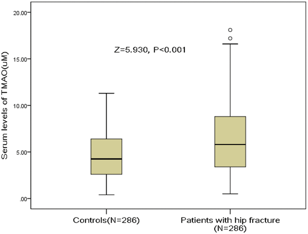 The median serum levels of TMAO in hip fracture patients was 5.8(IQR, 3.4-8.8) uM, which was significantly (P<0.001) higher than in those controls [4.3 (IQR, 2.6–6.4) uM], Figure 1. A negative correlation between TMAO and BMD (r=0.183, P=0.004) was found. The TMAO serum levels also related to high-sensitivity C-reactive protein (r=0.212, P<0.001) and Ca (r=0.186, P=0.003) in hip fracture patients. The serum levels of TAMO were associated with the number of falls in hip fracture patients (r=0.439, P<0.001) and in controls (r=0.338, P<0.001). No correlations were found between the serum levels of TMAO and the remaining binary variables (all, P>0.05).