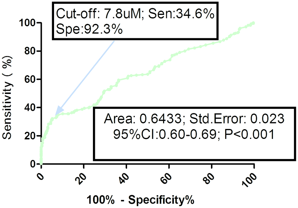 As shown in the Figure 2, the optimal cutoff level of serum TMAO was estimated to be 7.8uM, which yielded an AUC of 0.64 (95% CI, 0.60–0.69), and the sensitivity and specificity were 34.6% and 92.3%, respectively. Similarly, multivariable analysis models were used to assess adjusted OR and 95% CI of hip fracture for elevated TMAO (defined as TMAO≥cut-off value; with normal TMAO as reference). The results showed that elevated TMAO related to high risk of hip fracture (unadjusted OR 6.38, 95% CI: 3.84–10.59). In multivariable analysis, there was an increased risk of hip fracture in those patients with elevated TMAO (OR 3.68, 95% CI: 2.04–5.96; P<0.001) after adjusting for above confounders.