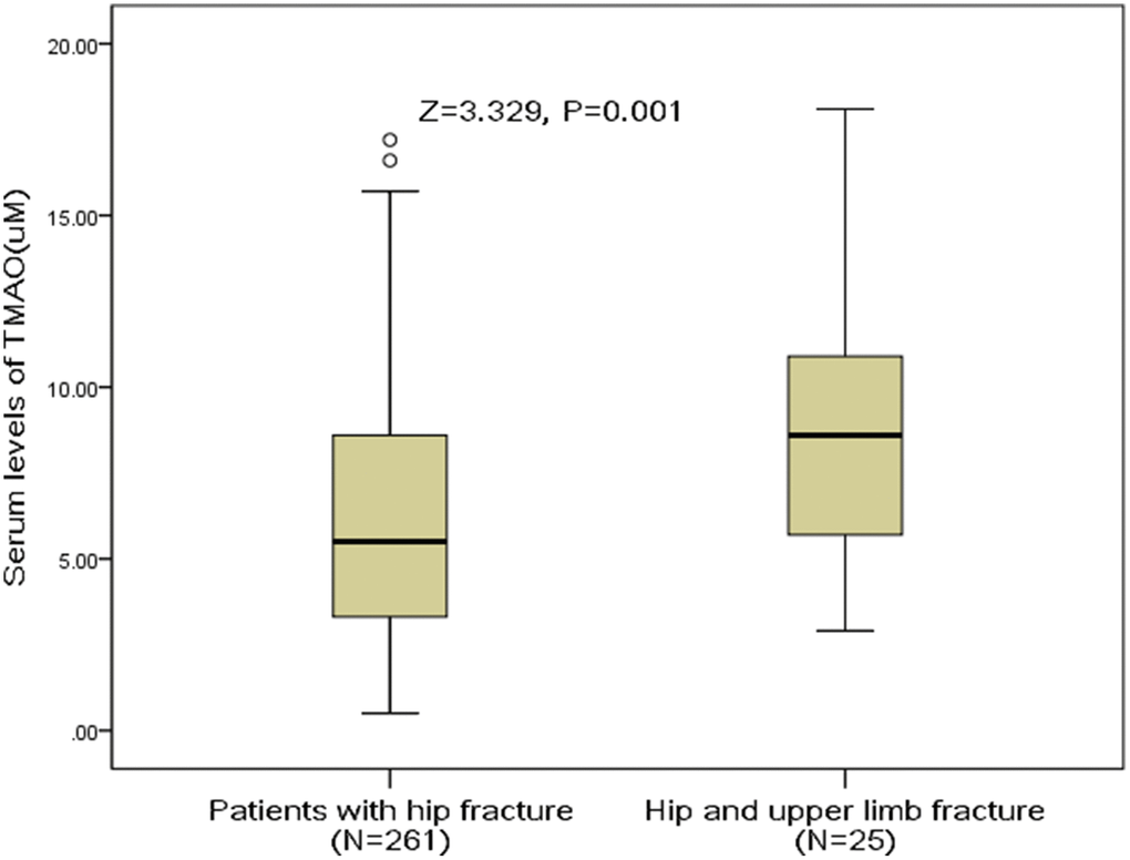 BMD levels; (3) High level of TMAO was proved a predictor of both hip fracture and had upper limb fracture combined hip fracture, after the adjustment of other existing risk factors [e.g., for each 1 uM increase of TMAO, odd ratio 1.16 (95% CI, 1.07–1.25), P < 0.001; and 1.12(95% CI, 1.03–1.26), P=0.008, respectively].