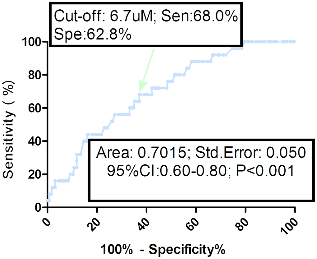 As shown in the Figure 4, the optimal cutoff level of serum TMAO was estimated to be 6.7uM, which yielded an AUC of 0.70 (95% CI, 0.60–0.80), and the sensitivity and specificity were 68.0% and 62.8%, respectively. Similarly, multivariable analysis models were also used to calculate adjusted OR and 95% CI of hip and upper limb fracture for elevated TMAO (defined as TMAO≥cut-off value; with normal TMAO as reference). The results showed that an increased risk of hip and upper limb fracture was associated with elevated TMAO (unadjusted OR 3.01, 95% CI: 1.28–7.06; P=0.012). In multivariable analysis, there was an increased risk of hip and upper limb fracture in those patients with elevated TMAO (OR 1.75, 95% CI: 1.21–2.43; P=0.039) after adjusting for possible confounders.