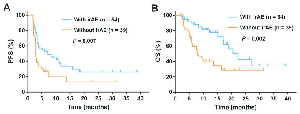 The Kaplan-Meier survival analysis was performed to evaluate the impact of irAEs on progression-free survival (PFS) and overall survival (OS) in patients treated with PD-1 inhibitors. Compared with no irAEs, the development of irAEs was significantly associated with increased PFS (median 7.1 months; 95% CI, 1.9-12.3 versus 2.8 months; 95% CI, 2.7-2.9; P = 0.007) and OS (median 20.5 months; 95% CI, 15.2-25.8 versus 8.0 months; 95% CI, 6.7-9.3; P = 0.002) (Figure 1A and 1B).