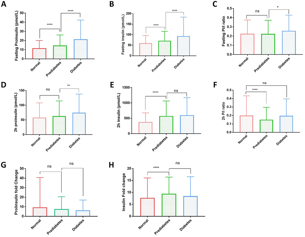2-hour glucose stimulation increased the proinsulin levels to around 5~10 folds in all subgroups (Figure 1G). However, 2-hour glucose stimulation increased the insulin levels significantly higher in prediabetic and diabetic group (Figure 1H), suggesting that insulin production remains sensitive to glucose stimulation and is not the major reason for hyperglycemia in type 2 diabetes in this cohort.