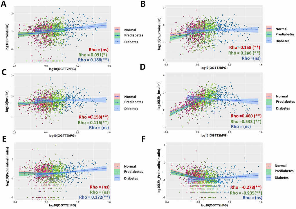 Interestingly, the patterns of scatter plot of diabetic groups were quite different from normal and prediabetic groups in some cases (Supplementary Figure 3D–3F), prompting us to study the correlation in the subgroups. Importantly, although the correlations in subgroups generally agreed with that of the whole population (Figure 4A, 4B, 4E), there were some novel observations. Both normal and prediabetic groups had moderate, positive associations between postprandial insulin levels and OGTT2hPG (Figure 4D, Rho = 0.460 and 0.533, respectively). The regression coefficient β were 0.408 and 0.423 for normal and prediabetic groups, respectively, and the associations remained significant after adjusting for age, sex and BMI (Table 1). In contrast, the diabetic group did not show a significant association between postprandial insulin and OGTT2hPG, although trending a negative correlation (Figure 4D). The fasting P/I ratio became significantly associated with OGTT2hPG in diabetic groups (Figure 4E, Rho = 0.172), but not in the whole population (Supplementary Figure 3E). Again, in normal and prediabetic groups, glucose-stimulated P/I ratio were negatively correlated with OGTT2hPG but was trending positively in diabetic group (Figure 4F).