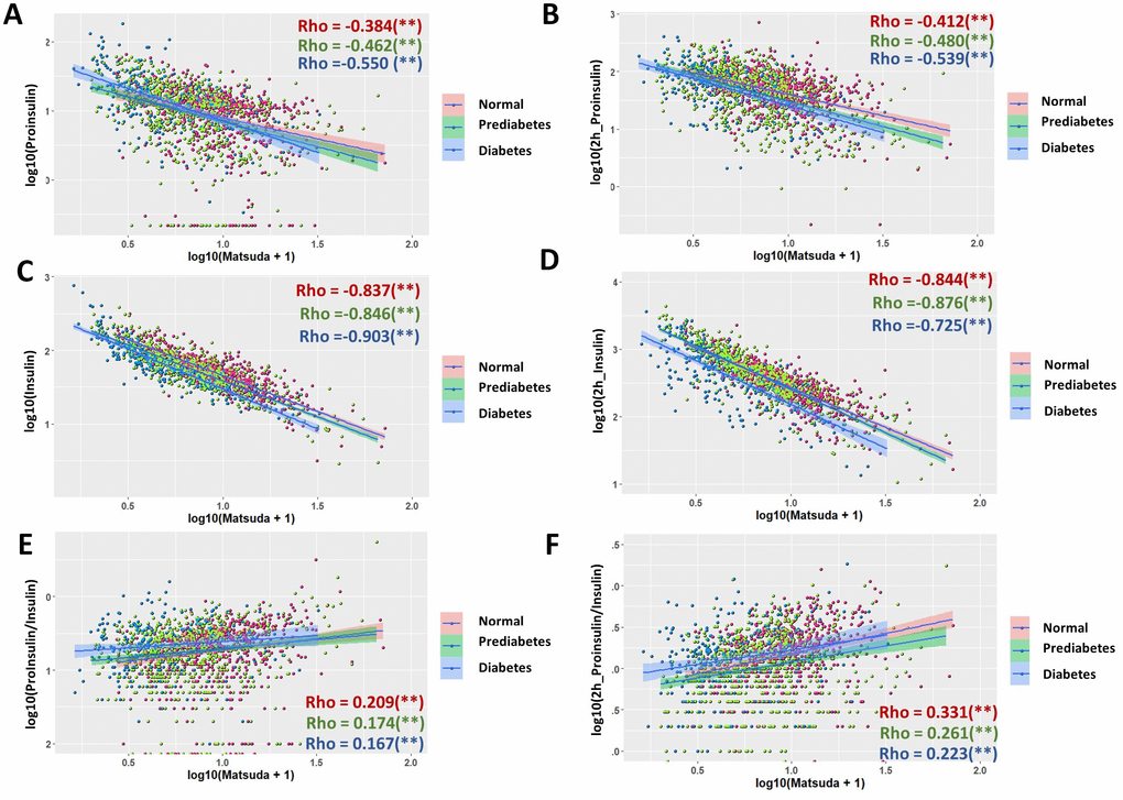 The exceptions are their associations with insulin sensitivity as measured by Matsuda index (Figure 5 and Supplementary Figure 4). Fasting and postprandial insulin are both strongly associated with Matsuda index. This is simply due to the fact that Matsuda index is calculated based on both fasting and postprandial insulin levels. What is interesting is that the fasting and postprandial proinsulin levels have moderate and negative association with Matsuda index in all subgroups, suggesting that they could serve as potential predictors of insulin sensitivity and hyperglycemia development.