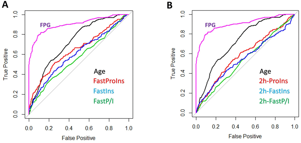 The weak association of proinsulin, insulin and P/I ratio with multiple diabetic indicators in the whole population suggest that they are not good predictor of diabetes development. To confirm this possibility, we used the widely applied Receiver Operating Characteristic (ROC) curve to evaluate prediction power of proinsulin, insulin and P/I ratio. As shown in Figure 6, a better predictor such as HbA1c was curving to the left upper corner. Our results showed that, compared to age, which is well correlated to FPG and HbA1c and a moderate predictor of diabetes, all proinsulin, insulin and P/I ratio were weak predictors for diabetes (Figure 6A). After 2-hour glucose stimulation, the proinsulin, insulin and P/I ratio remained weak predictors for diabetes (Figure 6B). Interestingly, the P/I ratio in both fasting and postprandial conditions was the least effective predictor of diabetes, contrasting to some previous studies. These results were consistent with our association studies in the whole population, which suggest that, in the whole population, the proinsulin, insulin and P/I ratio are not powerful predictors of diabetes.