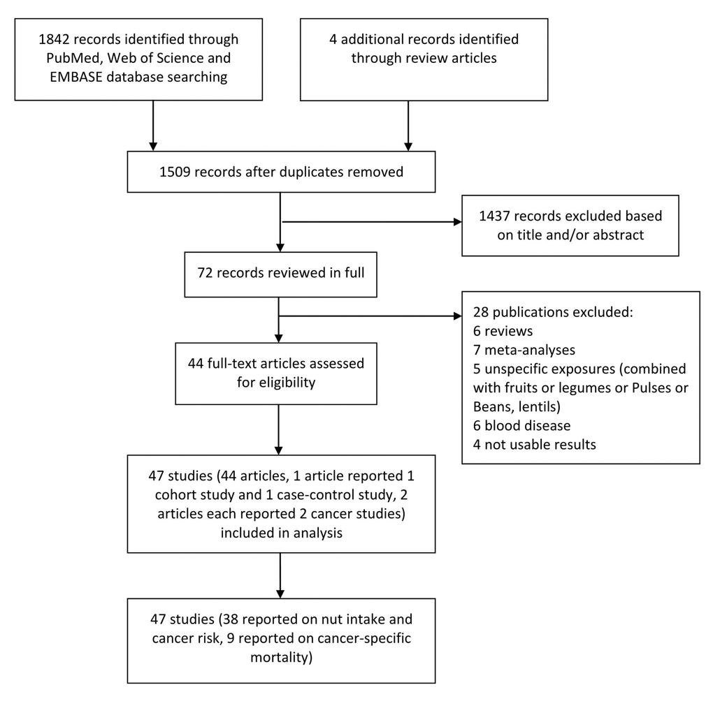 We searched PubMed, the Web of Science, and Embase databases for relevant studies on nut consumption and cancer published up to August 2019. The terms “cancer(s)” [Title/Abstract], “tumor(s)” [Title/Abstract], and “neoplasm(s)” [Title/Abstract] in combination with “Nuts” [Mesh], “nut(s)” [Title/Abstract], “peanut(s)” [Title/Abstract], “tree nut(s)” [Title/Abstract], “Walnut(s)” [Title/Abstract], “pecan(s)” [Title/Abstract], “almond(s)” [Title/Abstract], “pistachio(s)” [Title/Abstract], “coconut(s)” [Title/Abstract], “macadamia nuts” [Title/Abstract], and “cashew(s)” [Title/Abstract] were used in the search. No restrictions were imposed except English language publication and inclusion of human subjects. We manually reviewed the reference lists of all relevant articles to ensure that no relevant studies were missed.