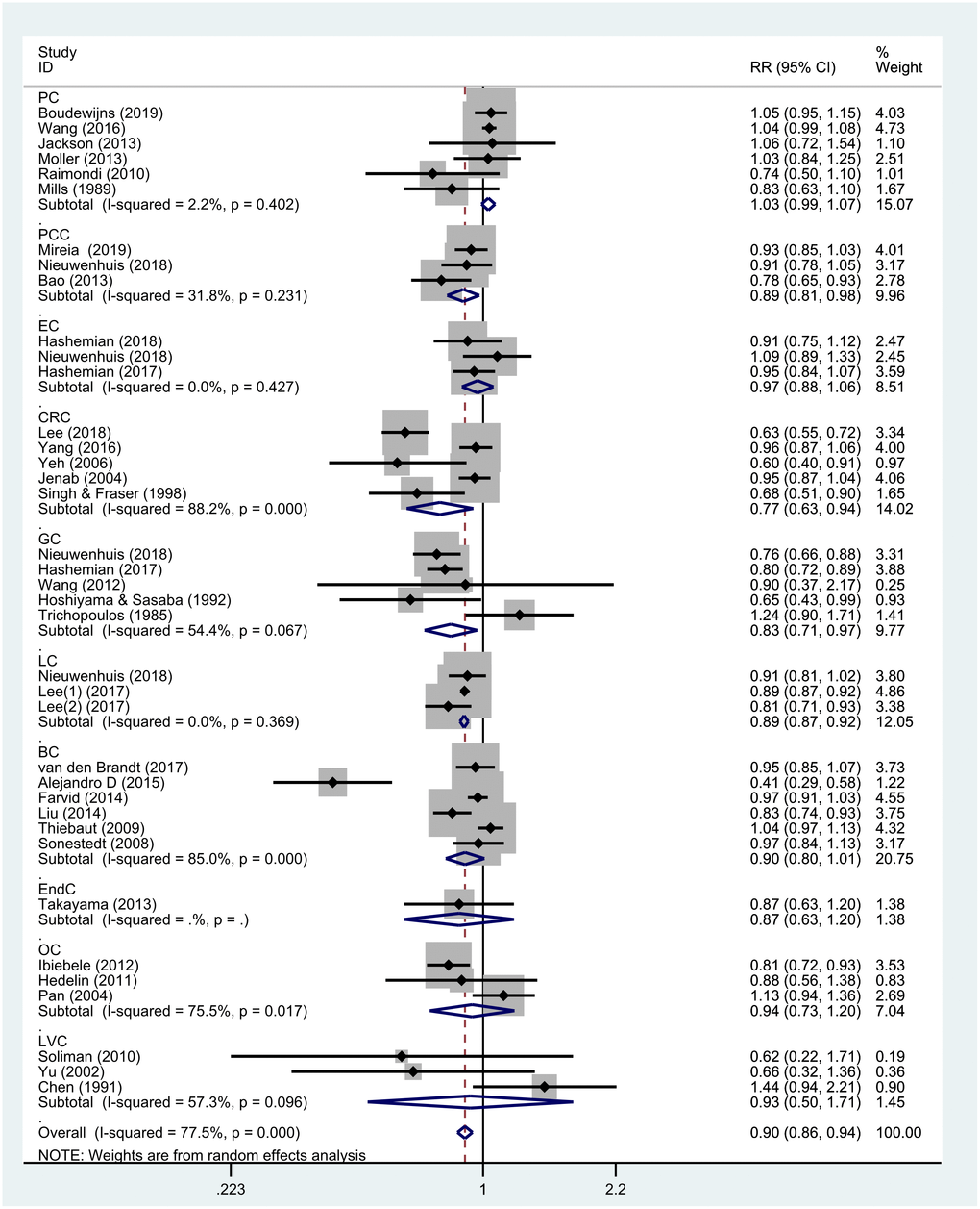 | Colorectal cancer | 5 | 0.77 | (0.63-0.94) | 0.011 | 88.2 | <0.001 | |||||||||||||||||||||||||||||||||||||||||||||||||||||||||||||||||||||||||||||||||||||||||||||