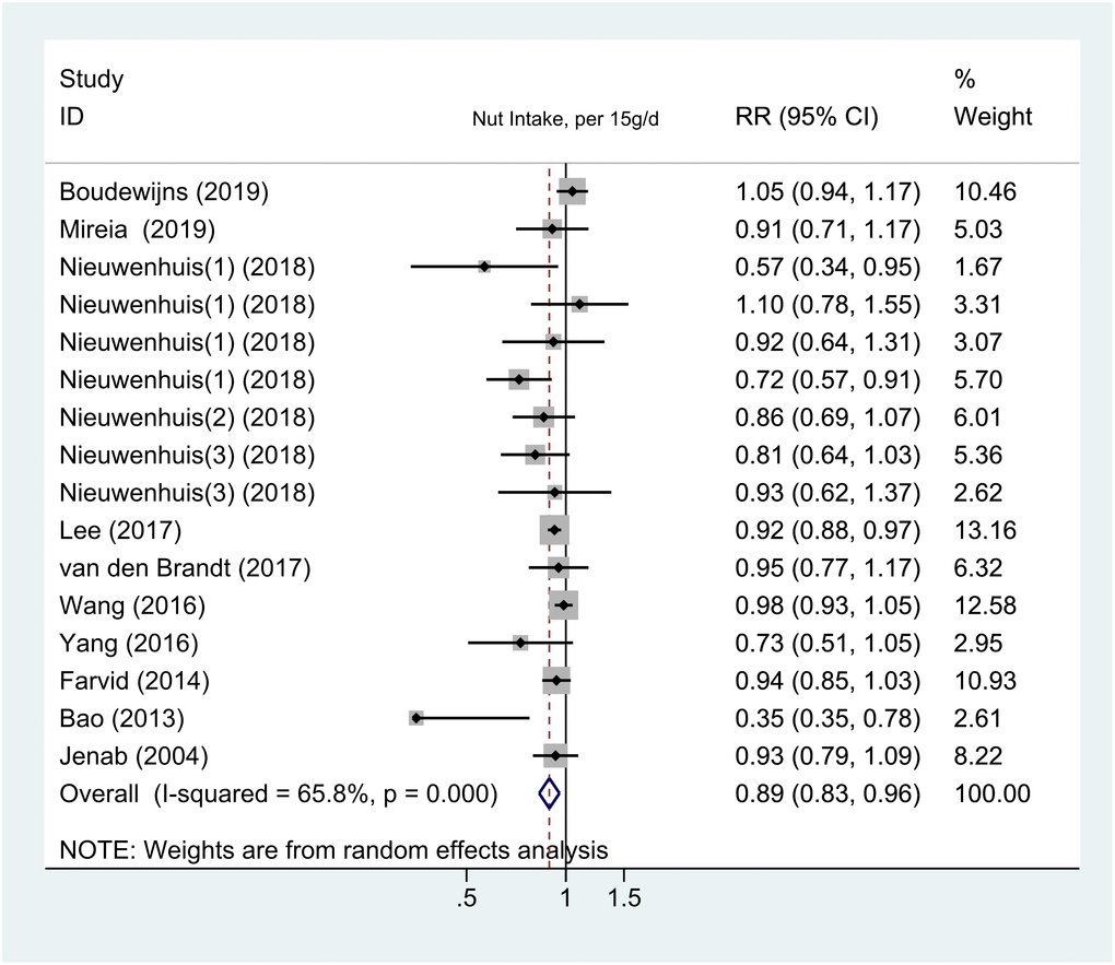 A significant inverse association was observed between nut intake and cancer risk in women (RR = 0.87; 95% CI, 0.79–0.95; P = 0.001), but the protective effect of nuts was not statistically significant in men (RR = 0.92; 95% CI, 0.84–1.01; P = 0.080) (Supplementary Figure 6).