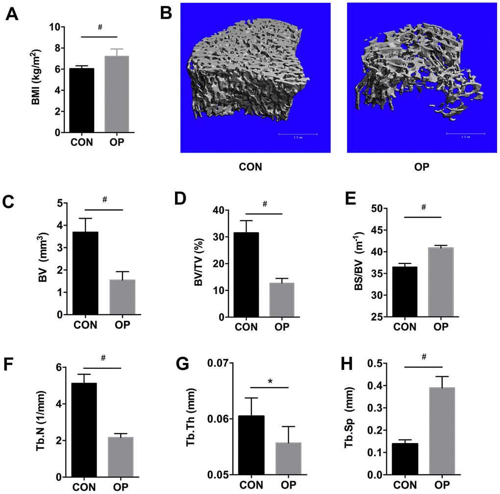 To verify the aged rat model of senile osteoporosis, micro-CT analysis and body mass index (BMI) were performed. As expected, the BMI was higher in aged rats (Figure 1A, P<0.01). Compared with the control group (the CON group, 6-month-old female SD rats), a deteriorated bone architecture was manifested by the three-dimensional reconstruction of micro-CT in the 22-month-old female SD rats (the OP group) (Figure 1B). Cancellous bone volume (BV) and bone volume fraction (BV/TV) decreased significantly in the OP group (P<0.01, Figure 1C, 1D), and a similar trend was found in trabecular number (Tb.N) and trabecular thickness (Tb.Th) (P<0.05, Figure 1F, 1G). In contrast, bone surface to bone volume (BS/BV) and trabecular separation (Tb.Sp) increased significantly (P<0.01, Figure 1E, 1H). Taken together, these results verified the animal model of senile osteoporosis in aged rats.