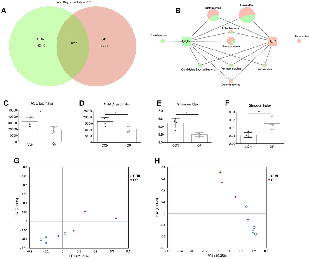 Although the number of OTUs was enriched in the OP group, alpha indexes including the ACE estimator, CHAO estimator, Shannon index and Simpson index revealed a lower alpha diversity compared with the control group (P<0.05, Figure 2C–2F). Principal coordinate analysis could also display the microbial structure by using both unweighted and weighted UniFrac. The visualized size of ecological distance between samples showed that the two groups could be divided into two different clusters and separated clearly. Principal coordinate 1 (PC1) (percent variation explained 29.71%) of the unweighted UniFrac separated the CON and OP samples (Figure 2G), while principal coordinate 2 (PC2) (13.15%) of the weighted UniFrac separated samples of two groups (Figure 2H). The diversity analysis revealed that the gut microecological environment was disordered explicitly in senile osteoporosis.