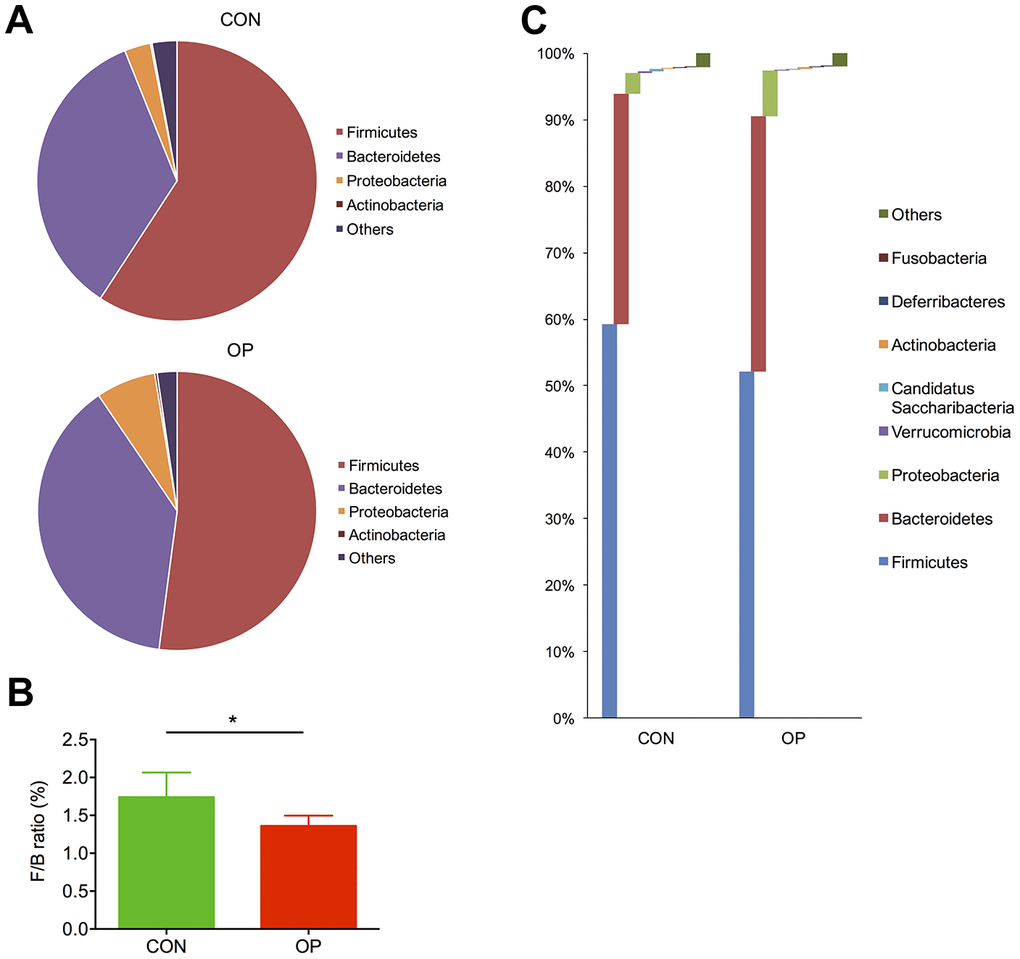Taxonomic differences were further analyzed by using the RDP classifier Bayesian algorithm. At the phylum level, the most abundant bacteria in both groups was Firmicutes, which decreased significantly in the OP group, while the other major microbial community, Bacteroidetes, showed the opposite tendency (Figure 3A). By calculating the Firmicutes/Bacteroidetes ratio (F/B ratio), we identified that there was a great reduction in this value from healthy controls (1.74) to osteoporotic rats (1.36) (P<0.05, Figure 3B). Apart from the relative abundance of those two major phyla, Proteobacteria also showed a decreasing trend in the OP group (6.91%, CON: 3.02%, q<0.01) (Figure 3C).