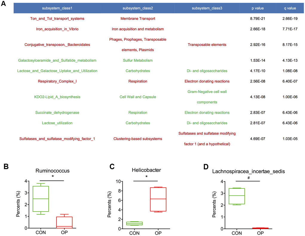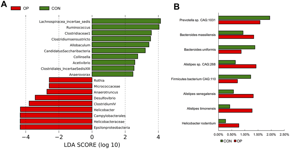 At the genus level, unclassified_Lachnospiraceae, unclassified_Porphyromonadaceae, unclassified_Ruminicoccaceae, Alistipes, Lactobacillus, Prevotella, and Helicobacter were the most abundant in all samples (Figure 4A). Then, the gut microbiota was analyzed by LDA effect size to determine the significant differences between both groups and classify the bacteria at the corresponding classification level (Figure 4B). The results showed that Clostridium sensu stricto, Clostridiaceae 1, Anaerovorax and Clostridiales_IncertaeSedisXIII (sub-Firmicutes) were more abundant in the CON group, and Helicobacter and Helicobacteraceae (sub-Proteobacteria) were more abundant in the OP group. The majority of the Bacteroidetes phylum (except Prevotella genes) also showed more abundant in the OP group (Figure 4C). Moreover, the four most abundant bacteria related to osteoporosis all belonged to the Proteobacteria phylum and showed a decreasing trend: Epsilonproteobacteria, Helicobacteraceae, Campylobacterales, and Helicobacter. The most negatively correlated bacteria belonged to the Firmicutes phylum: Lachnospiracea_incertae_sedis and Ruminococcus (Figure 5A). In order to identify the precise microbiome associated with senile osteoporosis, we used metagenome sequencing to annotate at the species level (Figure 5B). The presence of Bacteroides massiliensis, Alistipes sp. CAG:268, Alistipes senegalensis, Alistipes timonensis and Helicobacter rodentium might potentially lead to an increase in the phyla Bacteroidetes and Proteobacteria. However, the abundance of Prevotella sp. CAG:1031 and Bacteroides uniformis decreased in the OP group (q<0.01).