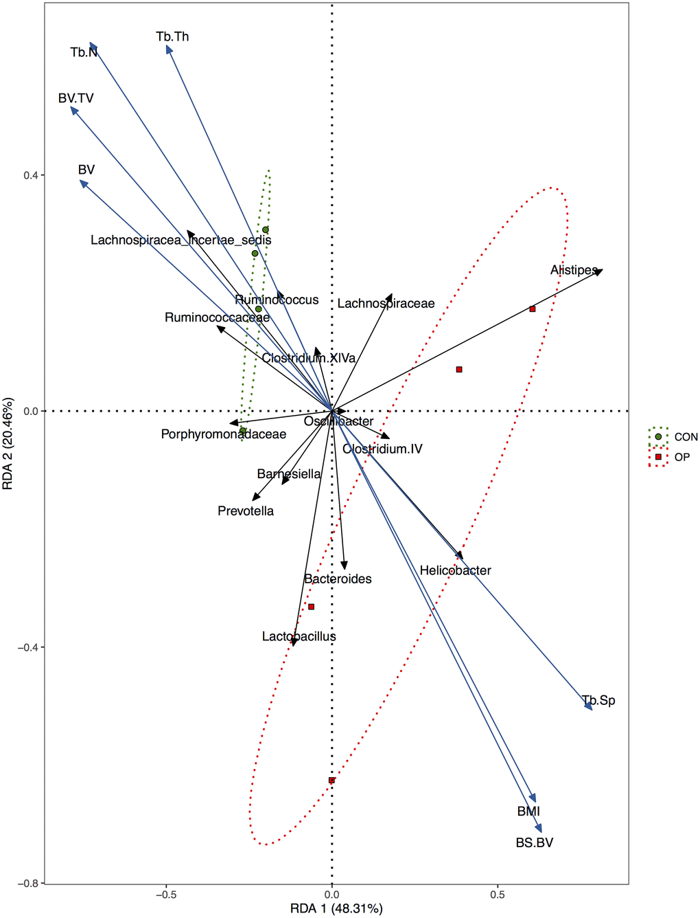 Redundancy analysis could visualize the association between bone histomorphometry parameters and GM by imaging. The blue arrows represent BMI and each parameter of bone histomorphometry, and the black arrows represent each GM at the genus level. The smaller the angle between two arrows was, the higher the positive correlation was. The green circles and red squares represent the control rat and osteoporotic rat samples, respectively (Figure 6). The results showed that the two groups were obviously separated, which indicated that the taxonomies were significantly different. In addition, Lachnospiracea incertae sedis, Ruminococcus and Clostridium XIVa were closely related to the control group and associated with osteogenesis. Meanwhile, Helicobacter and Bacteroides were positively correlated with osteoclastogenesis and higher BMI.