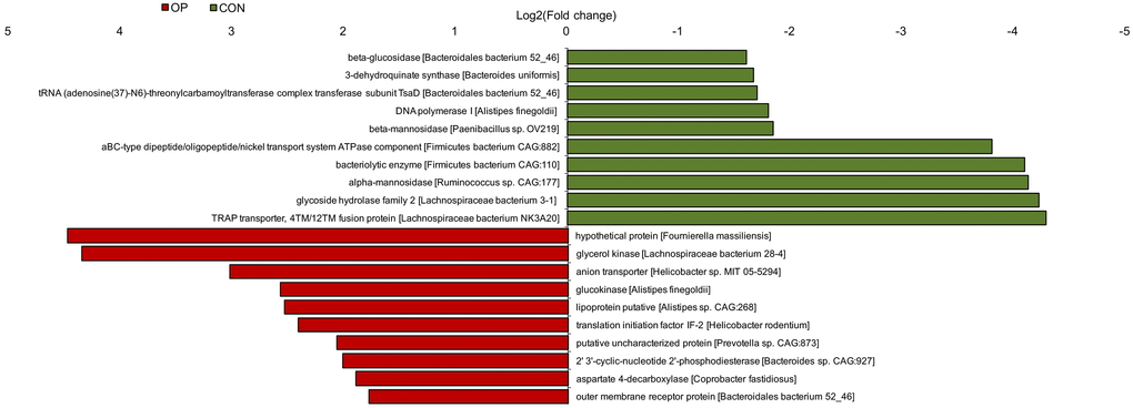 To further determine the functional genes that might be related to senile osteoporosis, metagenome sequencing was performed to analyze significant differences between the CON and OP groups based on the SEED database. Transposable elements, electron donating reactions and sulfatases and sulfatase modifying factor 1 (and a hypothetical) increased significantly in the OP group (q<0.01); in contrast, di- and oligosaccharides, gram-negative cell wall components, and electron donating reactions decreased significantly in the OP group (q<0.01) (Figure 7A). Then, we identified the relative bacteria through the ORF reads of those genes and found that Ruminococcus, Helicobacter, and Lachnospiracea incertae sedis might be potentially correlated with senile osteoporosis (Figure 7B–7D). To perform enrichment analysis, functional genes were also counted as log2 (fold change) values with significant differences (q<0.01), and changes in the abundance of functional genes were detected based on the Nr database. As shown in Figure 8, the ten genes with the most significant difference between the two groups were observed, including the species to which the genes belong. Overall, the genes could be classified into three categories: (1) synthesis and metabolism of carbohydrates: glucokinase, beta-glucosidase, beta-mannosidase, alpha-mannosidase, glycoside hydrolase; (2) genetic material activity: translation initiation factor IF-2, 2’ 3’-cyclic-nucleotide 2’-phosphodiesterase, DNA polymerase I; (3) protein and small molecular organics interaction: glycerol kinase, anion transporter, lipoprotein putative, aspartate 4-decarboxylase, outer membrane receptor protein, 3-dehydroquinate synthase, tRNA (adenosine(37)-N6)-threonylcarbamoyltransferase complex transferase subunit TsaD, aBC-type dipeptide/oligopeptide/nickel transport system ATPase component, bacteriolytic enzyme, TRAP transporter, and 4TM/12TM fusion protein. The glucose metabolism ability was relatively weakened in the OP group. According to the results of gene annotation, gene of glucokinase, anion transporter and translation initiation factor IF-2 had common gene sequences with Alistipes and Helicobacter which were marked in Figure 7. It was reported that up-regulation of anion transporter gene was associated with interleukin-17A (IL-17A) production [16]. So we speculated that the genes of function with significant differences from sequencing were correlated to Alistipes and Helicobacter.