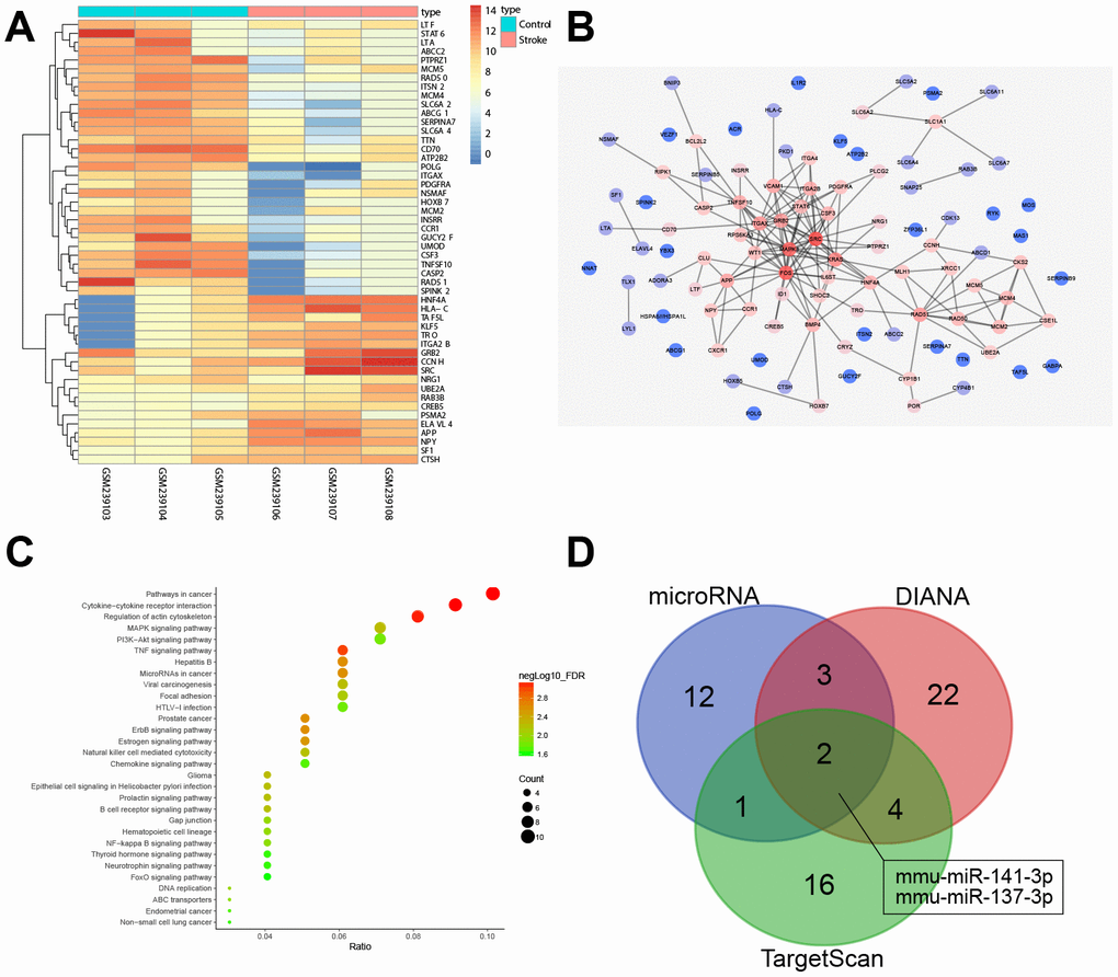 Microarray data associated with ischemic stroke (GSE9391) were downloaded from the Gene Expression Omnibus (GEO) Database (http://www.ncbi.nlm.nih.gov/geo). Standard pretreatment of the microarray data was conducted using the "limma" package in R language. The minimum criteria for identifying differentially expressed genes (DEGs) were a p value < 0.05 and |LogFoldChange| > 2. The expression of the DEGs was used to generate a heat map. Genes of interest in the String database were then analyzed for their ability to interact (interaction score > 0.4), followed by analysis of the Kyoto Encyclopedia of Genes and Genomes (KEGG) for gene enrichment. The Cytoscape 3.6.0 software was used to visualize the protein-protein interaction (PPI) network of the DEGs. miRNAs that potentially regulate DEGs were analyzed using the DIANA (http://diana.imis.athena-innovation.gr/DianaTools/index.php?r=microT_CDS/index), TargetScan (http://www.targetscan.org/vert_71/) and microRNA databases (http://34.236.212.39/microrna/getGeneForm.do). Finally, miRNAs identified using the prediction software were compared using software that generates custom Venn diagrams (http://bioinformatics.psb.ugent.be/webtools/Venn/).