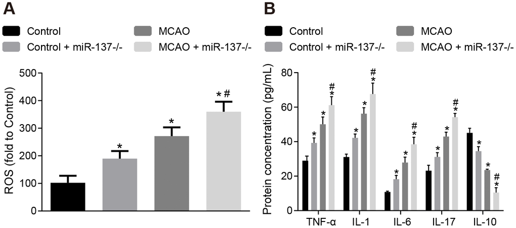 Afterwards, levels of ROS and inflammatory factors in brain tissues were detected. The concentration of ROS and the expression of TNF-α, IL-1, IL-6 and IL-17 were increased (Figure 10A, 10B), whereas IL-10 expression was decreased in brain tissues of wild-type mouse models of MCAO in comparison to sham-operated wild-type mice (p < 0.05). The results were similar in miR-137-/- mice (p < 0.05). These data indicate that inhibition of miR-137 augmented oxidative stress and inflammation in MCAO mice.