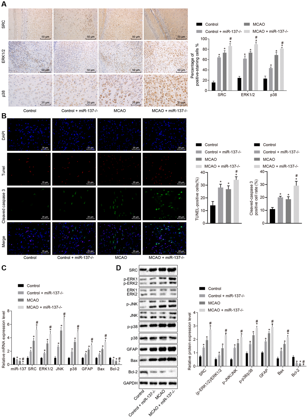 Immunohistochemistry was performed to identify the roles of miR-137 in the MAPK signaling pathway. The results showed an increase in positive staining for ERK1/2, p38 and Src in MCAO-operated miR-137-/- mice (Figure 11A) (p < 0.05) compared with sham-operated wild-type mice. Analysis of cleaved caspase 3, TUNEL, and DAPI staining (Figure 11B) revealed that the number of Cleaved caspase 3 and TUNEL double positive cells increased in MCAO-operated miR-137-/- mice in comparison to sham-operated wild-type mice (p < 0.05). RT-qPCR and Western blot analysis (Figure 11C, 11D) showed an increase in Src, ERK1/2, JNK, p38, GFAP and Bax expression as well as increased ERK1/2, JNK and p38 phosphorylation in the absence of miR-137-/- while expression of miR-137 and Bcl-2 was reduced (p < 0.05). These results suggest that knockout of miR-137 activated the MAPK signaling pathway, upregulated Gfap and Bax, and downregulated Bcl-2 by activating Src, and promoted cell apoptosis.