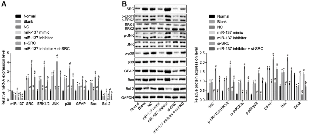 Next, RT-qPCR and Western blot analysis were performed to determine the expression of the MAPK signaling pathway-related genes in cell (Figure 12A, 12B). In comparison to normal astrocytes, astrocytes exposed to oxygen glucose deprivation (OGD) exhibited decreased levels of miR-137 and Bcl-2, but increased levels of Src, ERK2, JNK, p38, GFAP and Bax along with extent of ERK1/2, JNK and p38 phosphorylation (p < 0.05). Treatment with miR-137 mimic or si-Src eliminated the effects of OGD treatment on astrocytes (p < 0.05). These findings showed that the MAPK signaling pathway and Src were activated after OGD treatment and that miR-137 inhibited the Src and MAPK signaling pathways sequentially.